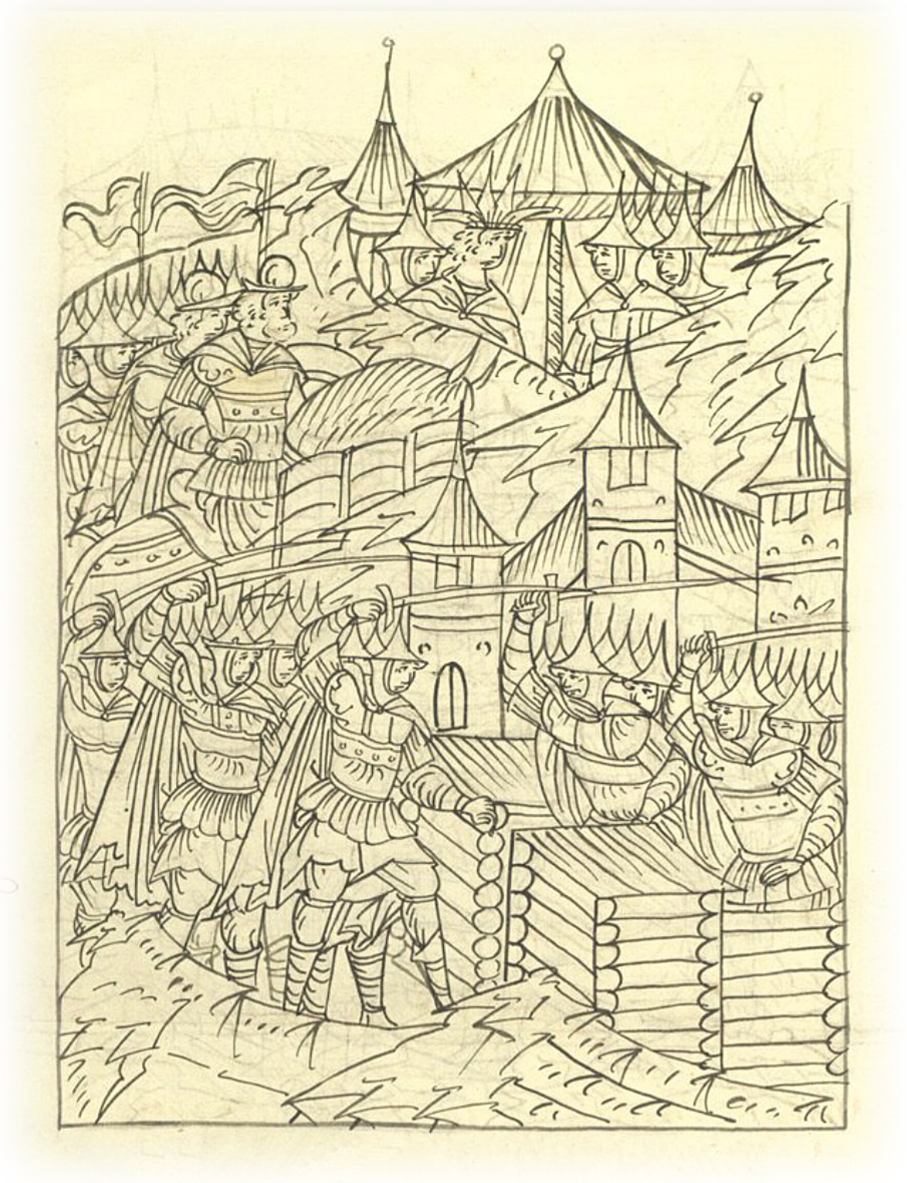 Языки говорят воеводам царя Ивана Васильевича, что магистр окопался большим рвом вокруг города Рындола, бьет из пушек и пищалей и приступает к Рындолу.