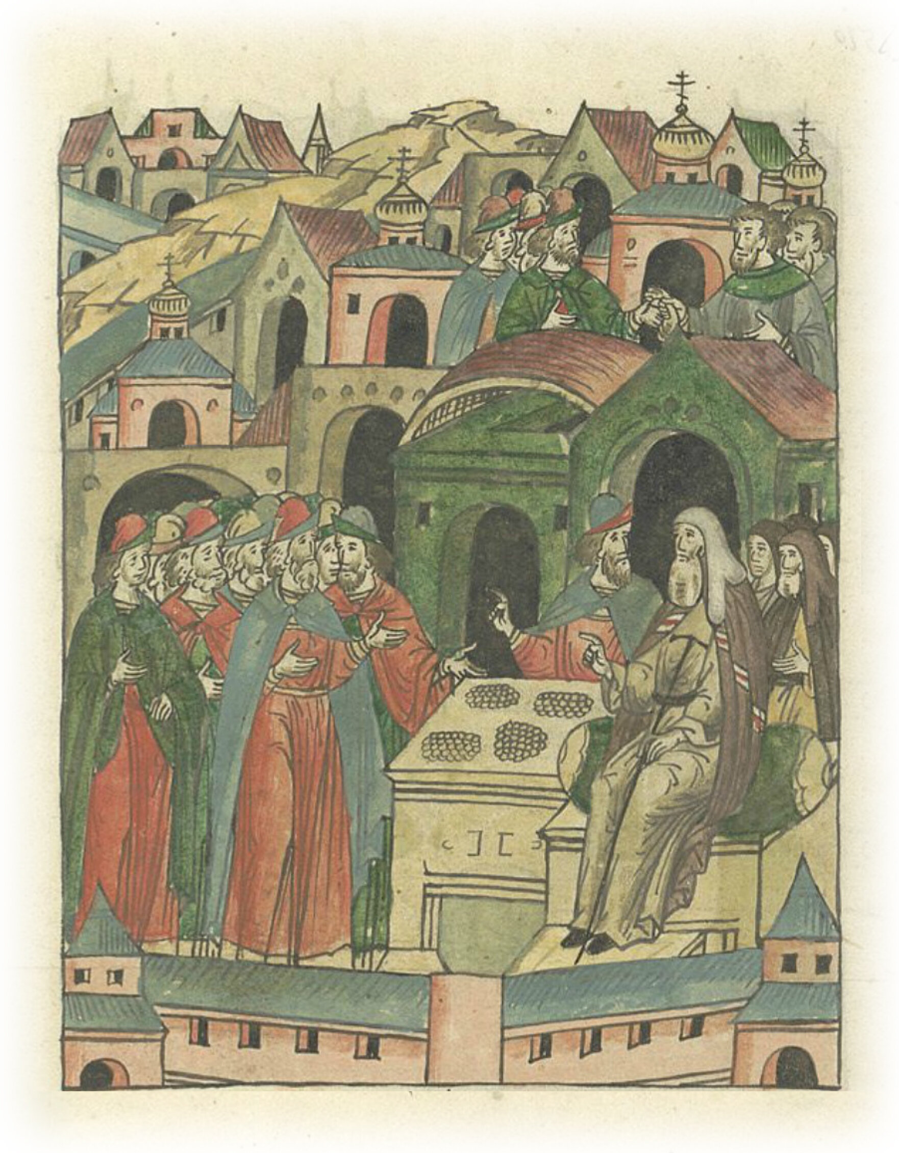 Митрополит Митяй собирает дань с церквей, взимает доходы, налоги и оброки.