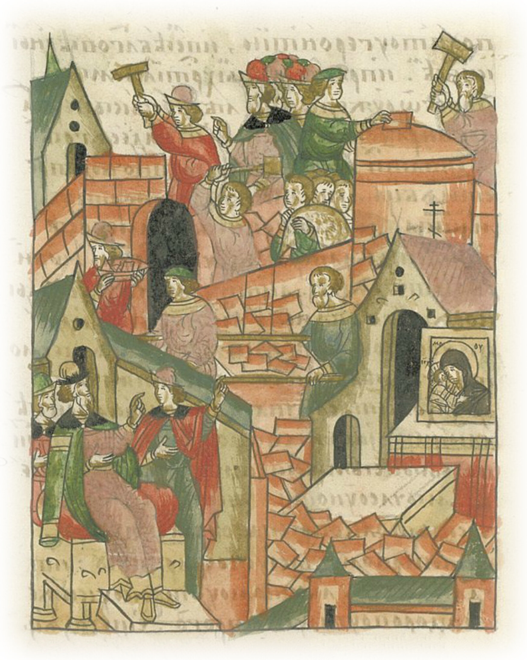 После того князь великий оставшиеся своды и столпы с южной стороны, и стену переднюю, и оставшееся от полатей, и южную стену повелел разбирать, так как страшно было войти поклониться образу Пречистой и гробу чудотворца Петра, и прочих святителей.
