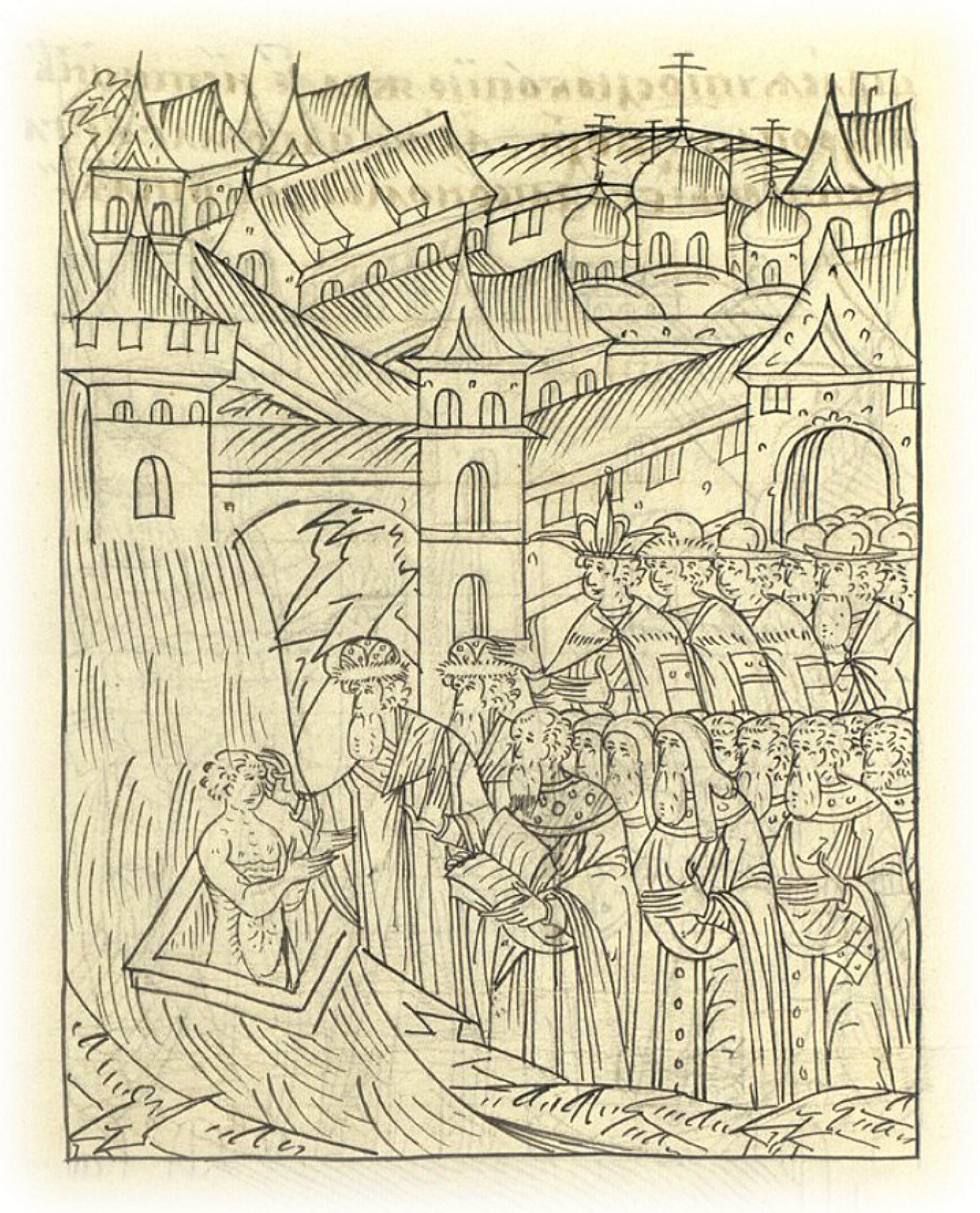 О крещении Казанского царя. Той же зимой 26 февраля, во второе воскресенье Поста, крещен был Казанский царь Едигер-Магмет на реке у тайника, а наречен был в святом крещении Симеон. А на крещении был благоверный царь и великий князь всея Руси Иван Васильевич и митрополит Макарий, и брат царя и великого князя князь Юрий Васильевич, и князь Владимир Андреевич и владыка Крутицкий, и весь собор, архимандриты и игумены, и протопопы, и множество бояр. А принял его от купели Макарий, митрополит всея Руси, а священствовал отец его духовный Амос, протопоп (церви) Николы Гостунского, и владыка Савва Крутицкий.