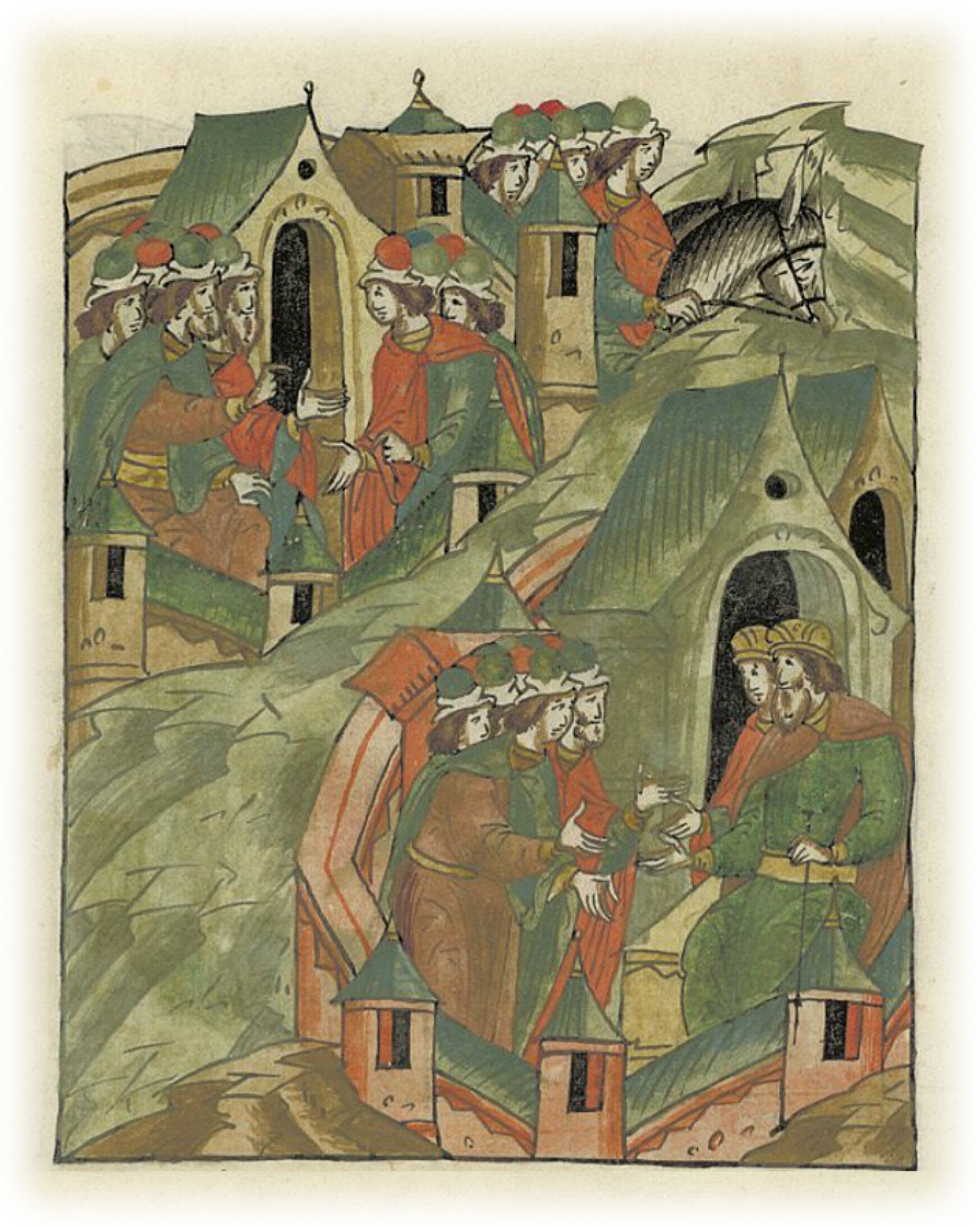 Ругодивские посадники Яким и Захар приезжают в Москву. Воеводы царя Ивана Васильевича Алексей Адашев и Иван Михайлов сообщают им, что государь пожалует их, если сдадут его воеводам помимо Ругодива Вышгород.