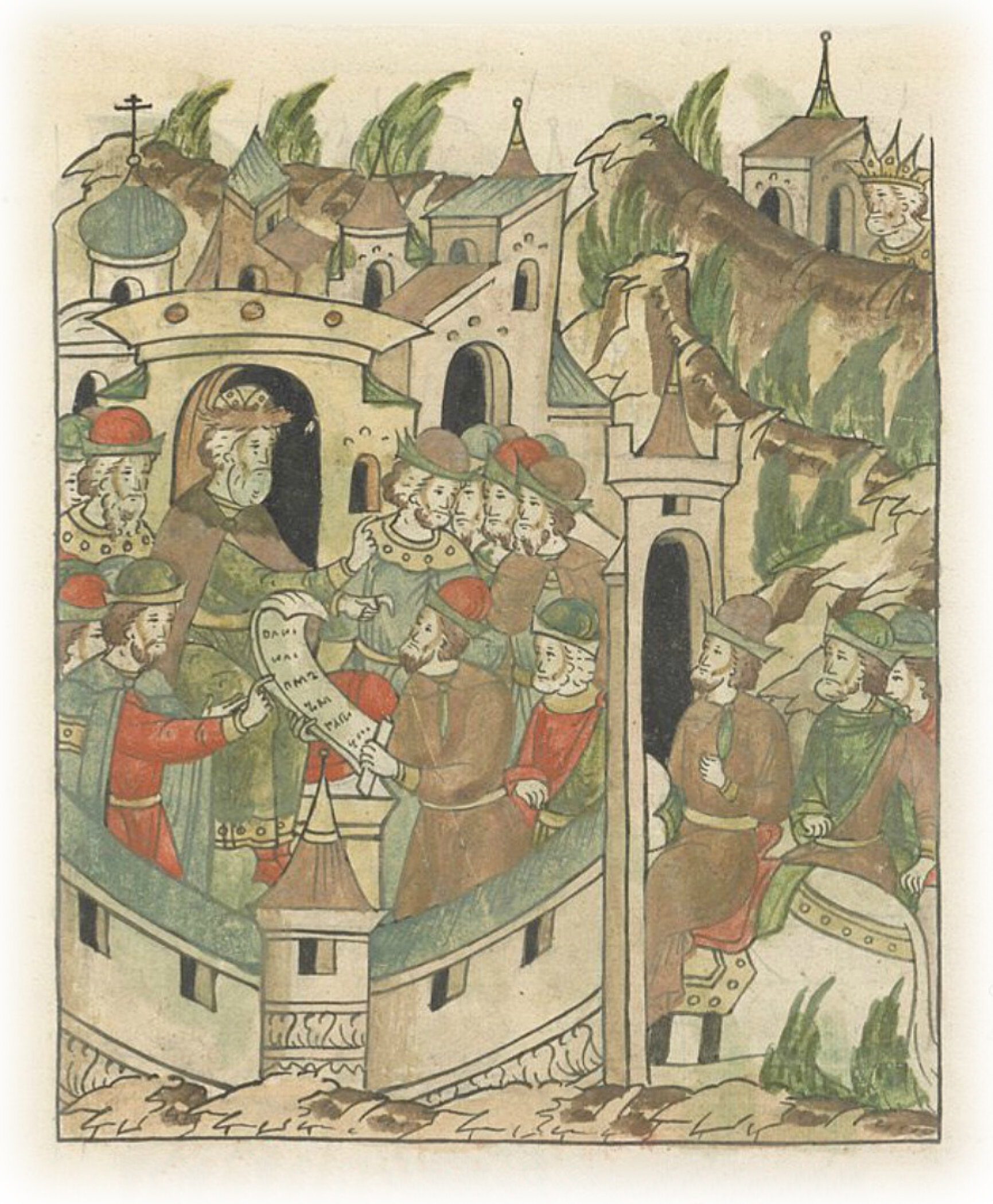 Посол Астраханского царя Абдыл-Рахмана Кудалияр приходит к великому князю Василию Ивановичу с грамотой о дружбе и любви.