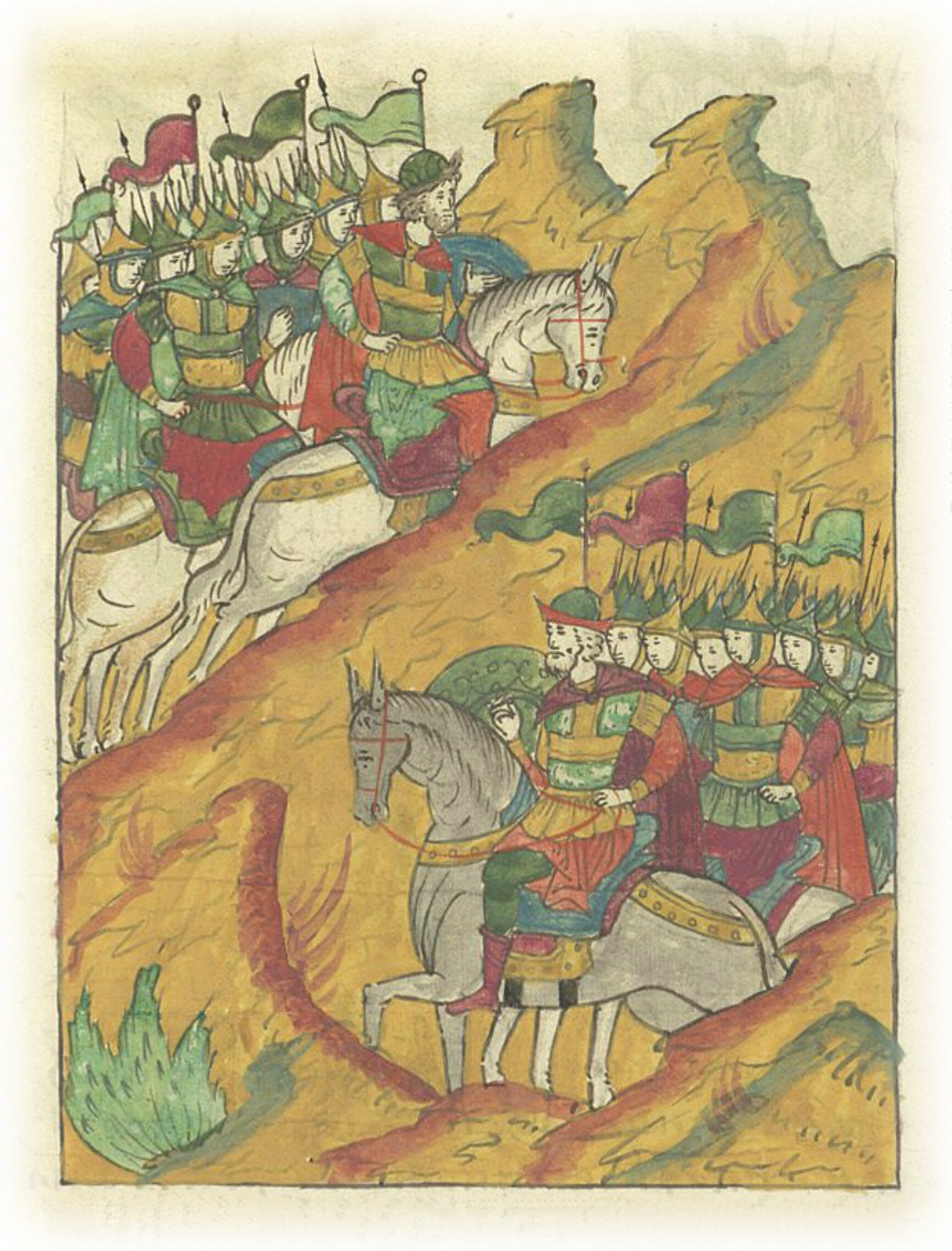 и с полками пошел на князя Ивана. А князь Иван против князя Андрея великого князя людям воевод назначил и полки установил; и, устроив полки, взяв Бога на помощь, пошел против князя Андрея. И увидел это князь Андрей, великого князя полки, и не захотел с великим князем в бой вступать,