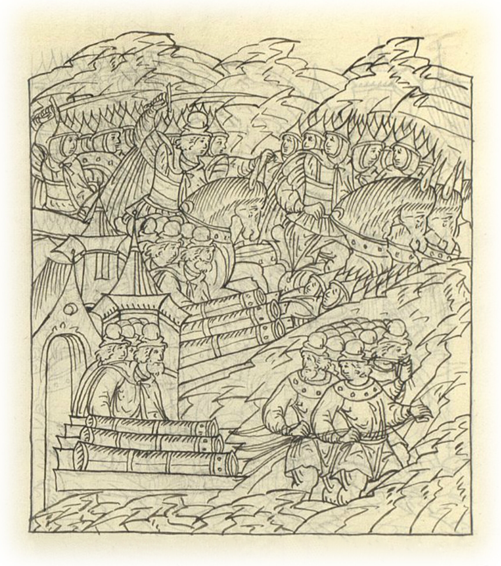 Языки говорят воеводам царя Ивана Васильевича, что магистр окопался большим рвом вокруг города Рындола, бьет из пушек и пищалей и приступает к Рындолу.