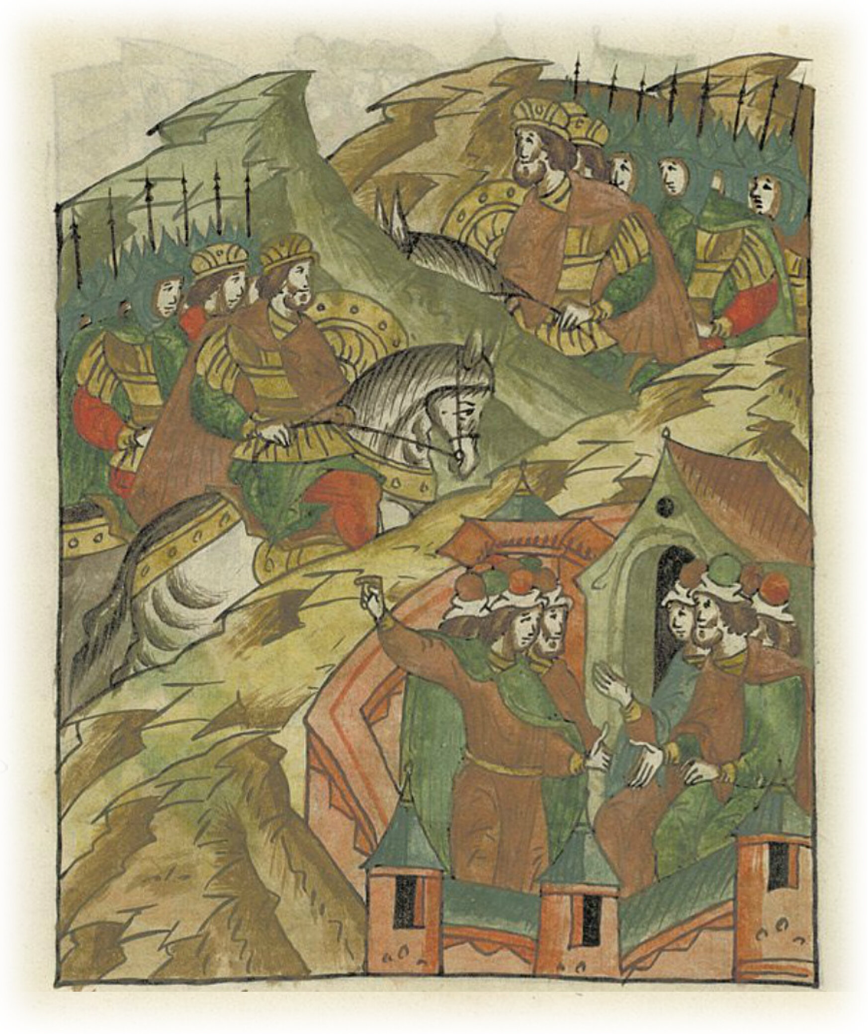 Языки говорят воеводам царя Ивана Васильевича, что магистр окопался большим рвом вокруг города Рындола, бьет из пушек и пищалей и приступает к Рындолу.