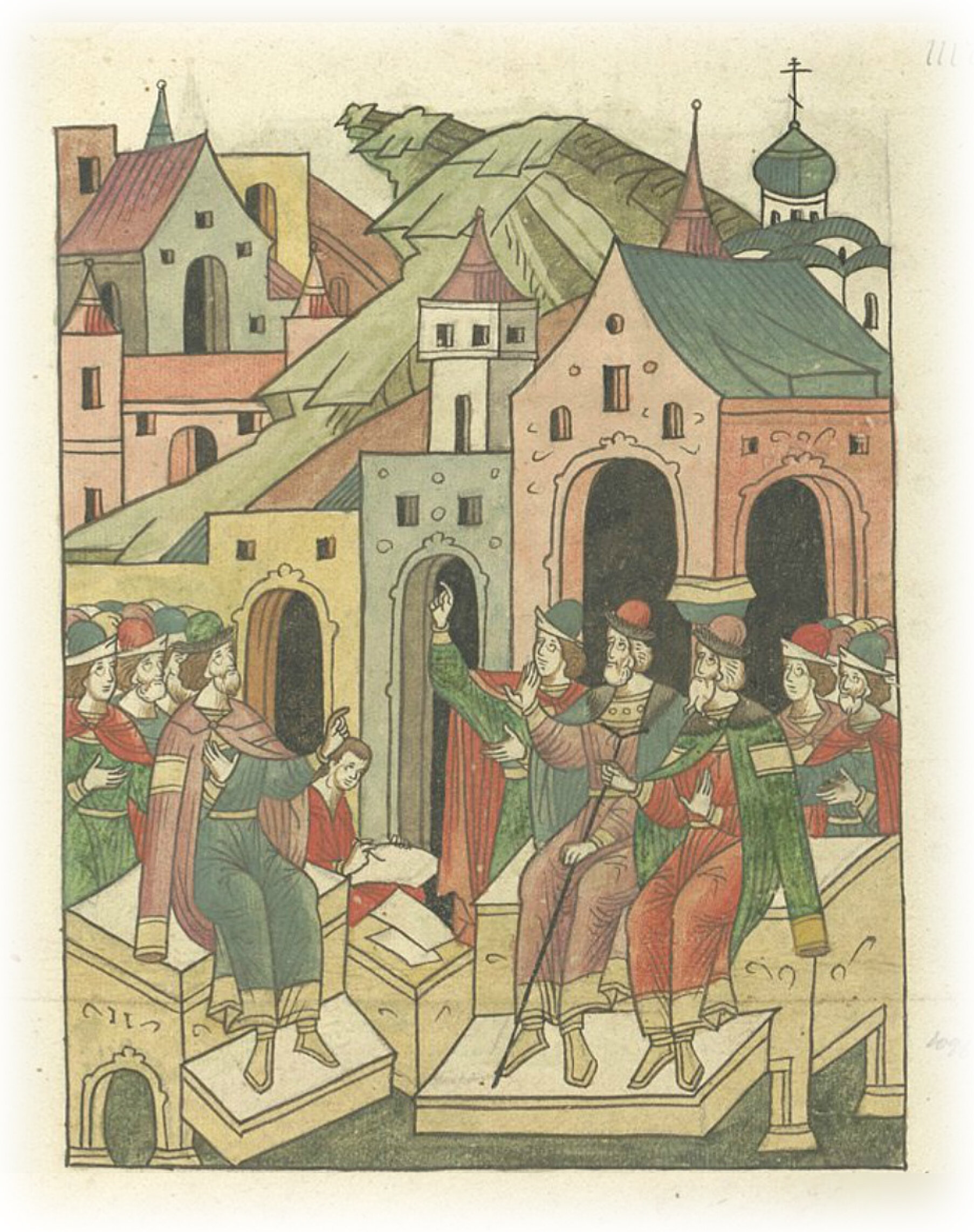 Ругодивские посадники Яким и Захар приезжают в Москву. Воеводы царя Ивана Васильевича Алексей Адашев и Иван Михайлов сообщают им, что государь пожалует их, если сдадут его воеводам помимо Ругодива Вышгород.