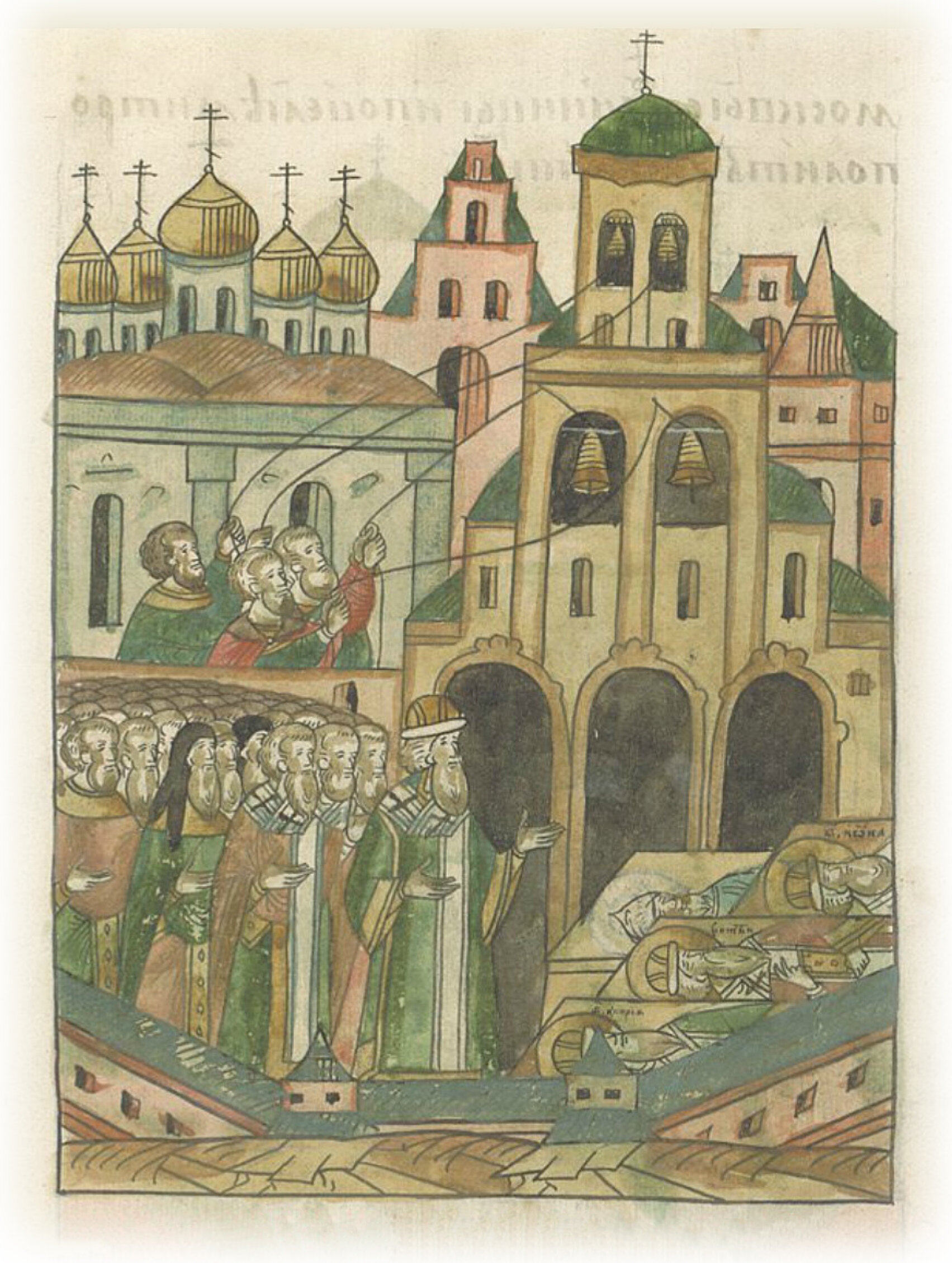 О перенесении в новую церковь мощей преосвященных митрополитов Киприана, Фотия и Ионы чудотворца, и мощей князя Юрия Даниловича. В том же месяце в 27 день в пятницу перед вечерней в 9 часов дня преосвященный митрополит Геронтий со всеми прежденазванными епископами приходит в церковь святого Иоанна Лествичника со всем освященным собором и со всего города Москвы священноиноками; и повелел митрополит звонить.