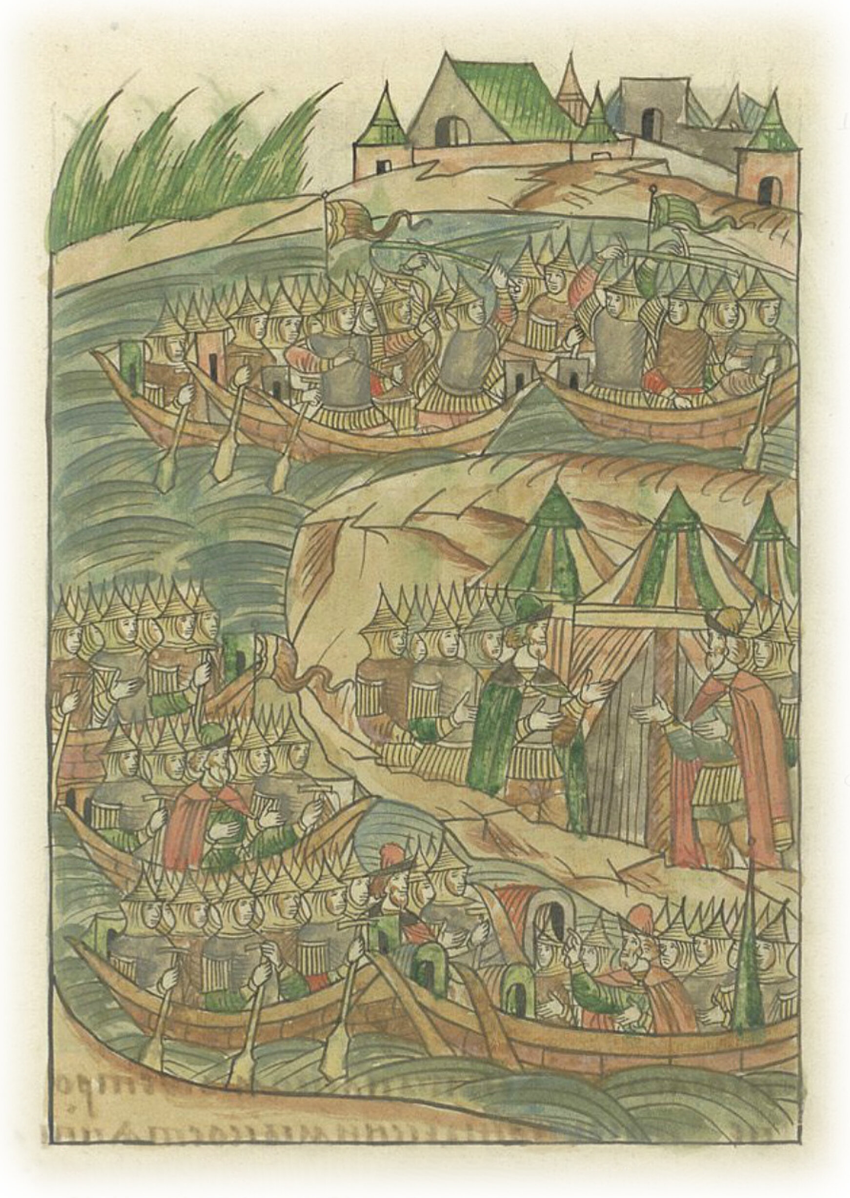 и, усердно сражаясь, погнали татар до самого города Казани, под стену; потом вернулись, и пошли на Ирихов остров, и соединились здесь вместе с большими судами.