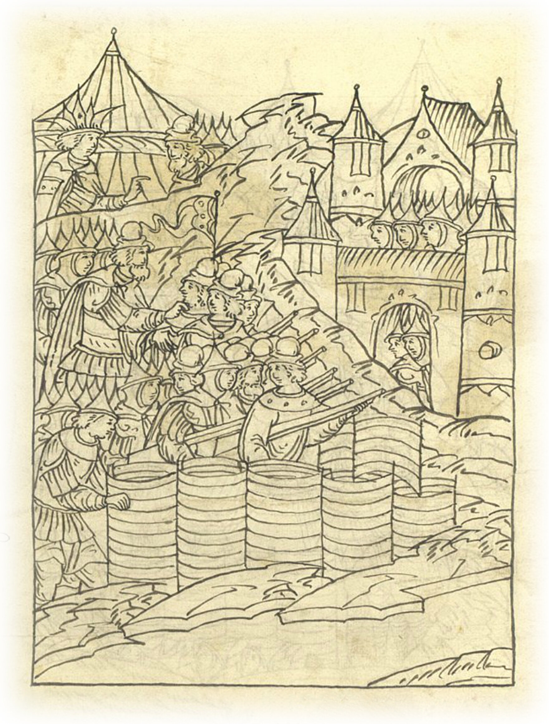 Языки говорят воеводам царя Ивана Васильевича, что магистр окопался большим рвом вокруг города Рындола, бьет из пушек и пищалей и приступает к Рындолу.