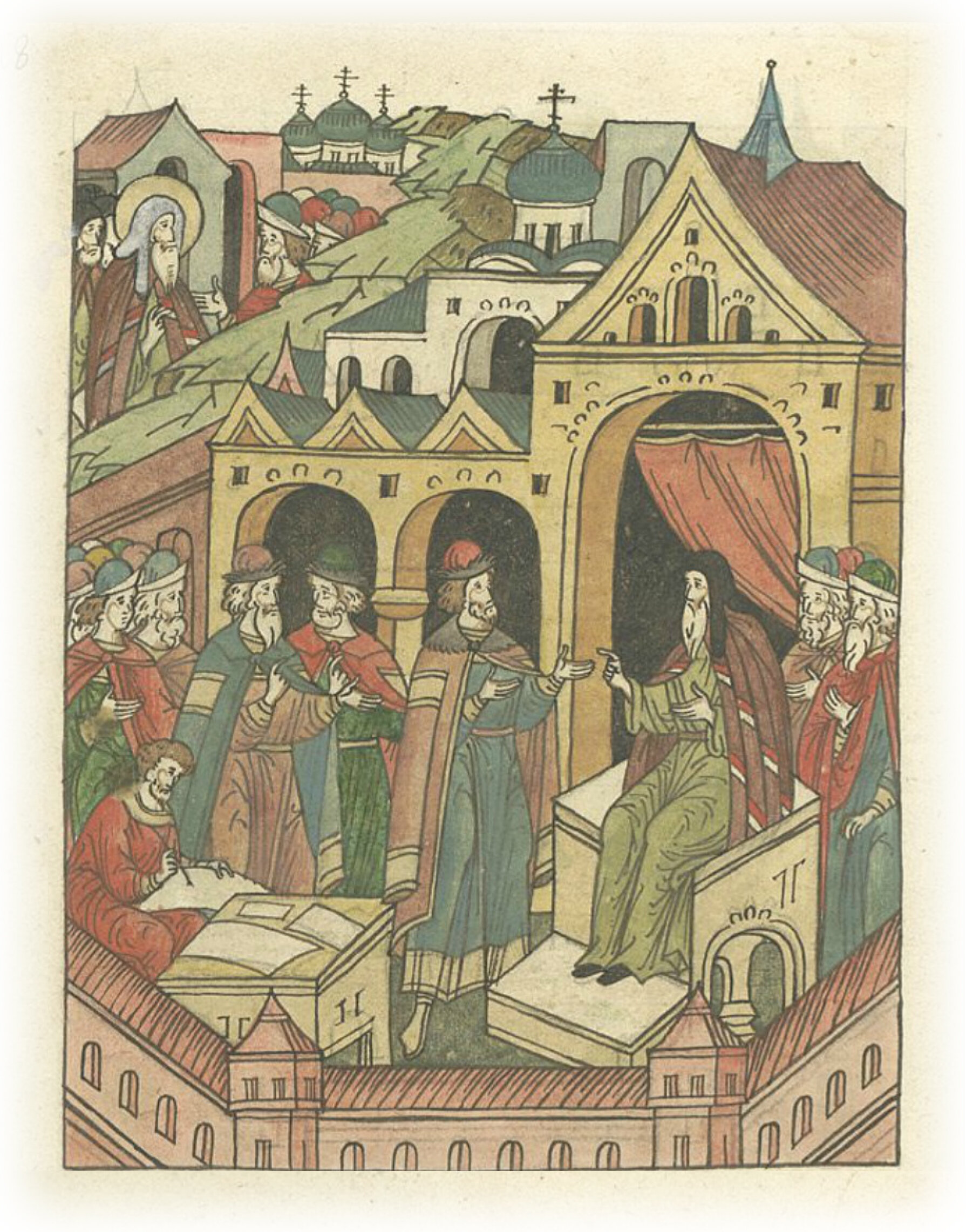 Владыка Василий судит враждующих князей Василия Михайловича и Михаила Александровича, оправдав последнего.
