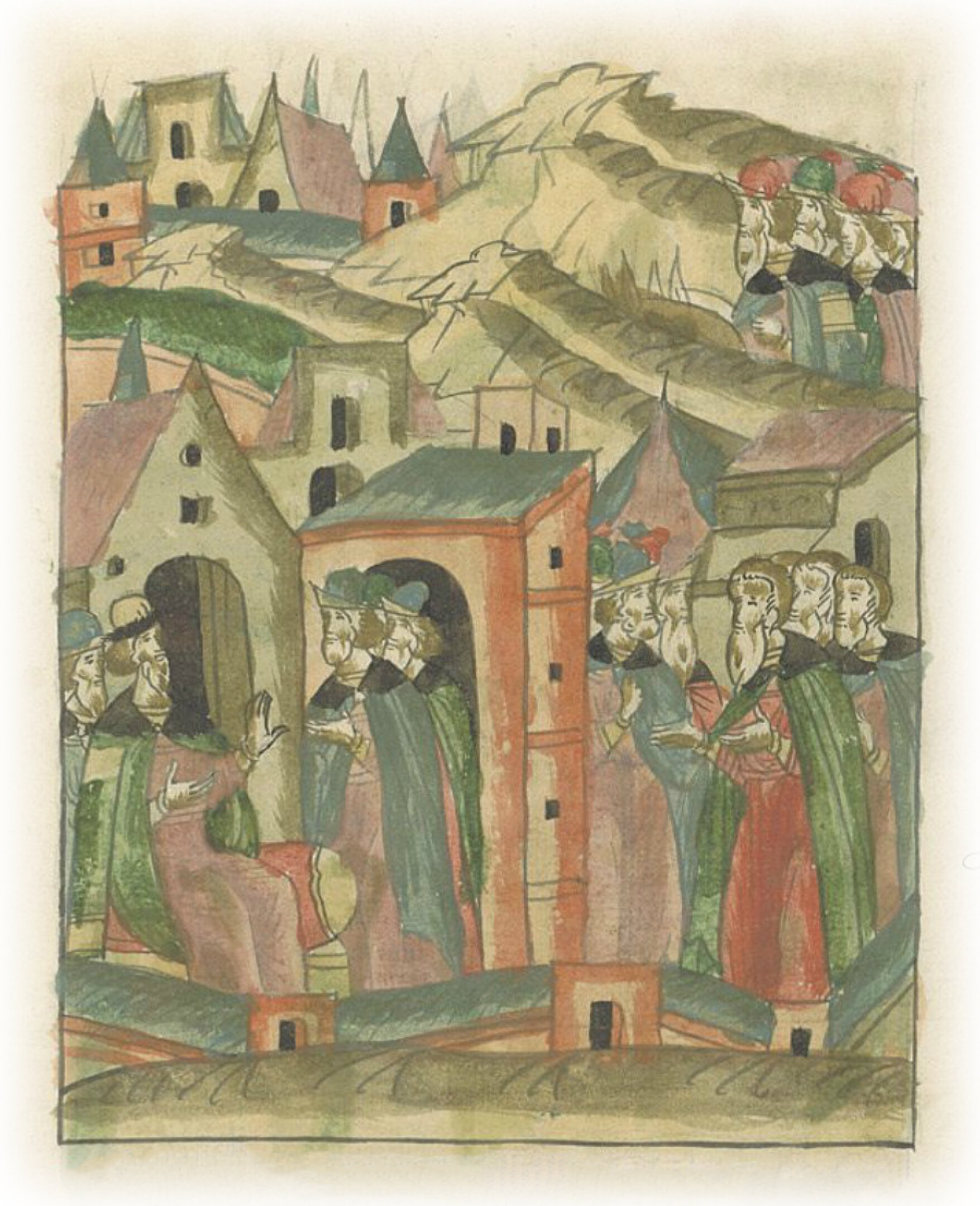 Великий князь Иван Васильевич гневается на псковских послов за легкие подарки и за то, что медлили приходить с челобитьем, и они со срамом возвращаются во Псков.