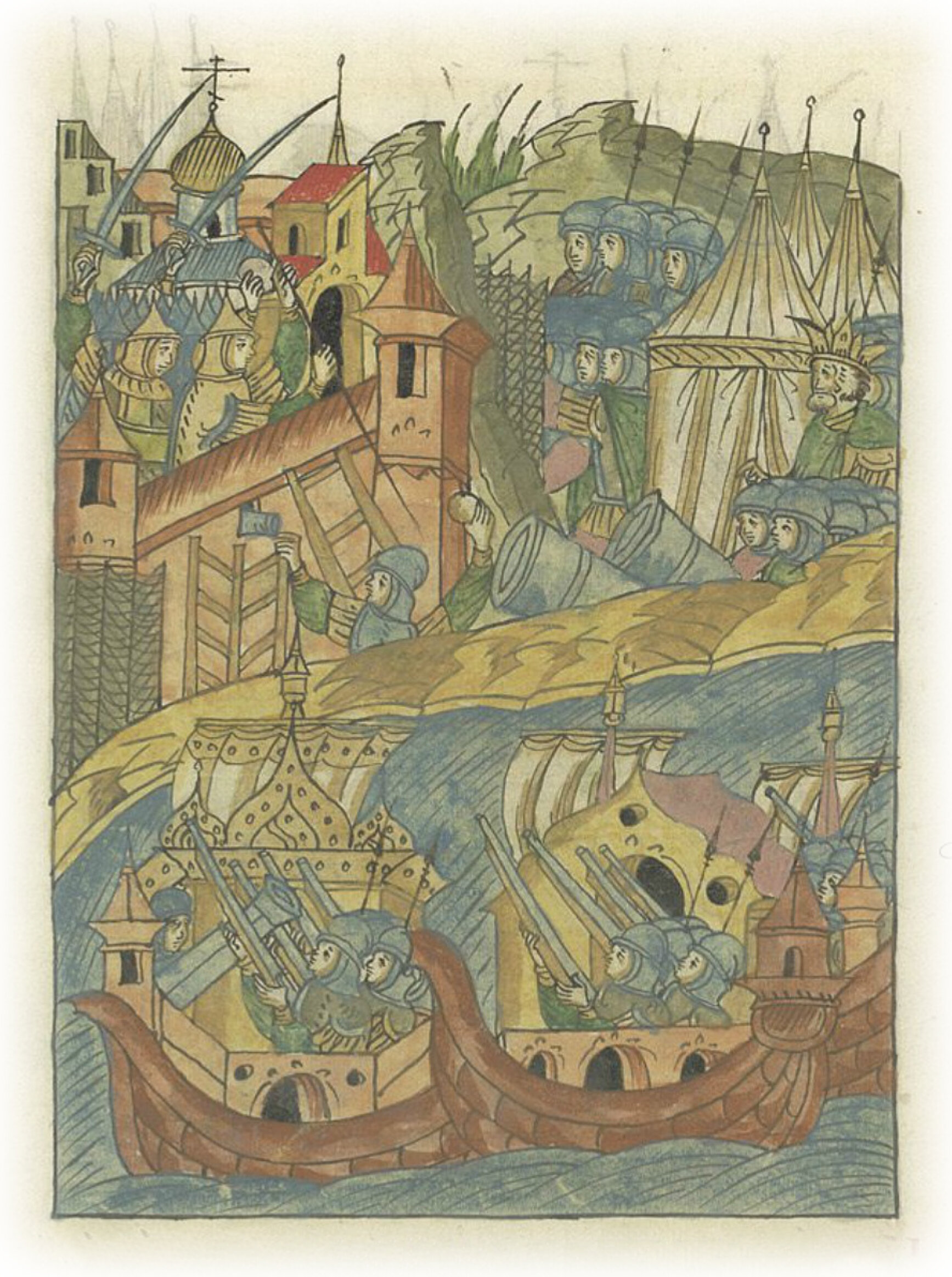 также по морю придвинулись корабли и галер множество; и начали бить по городу отовсюду