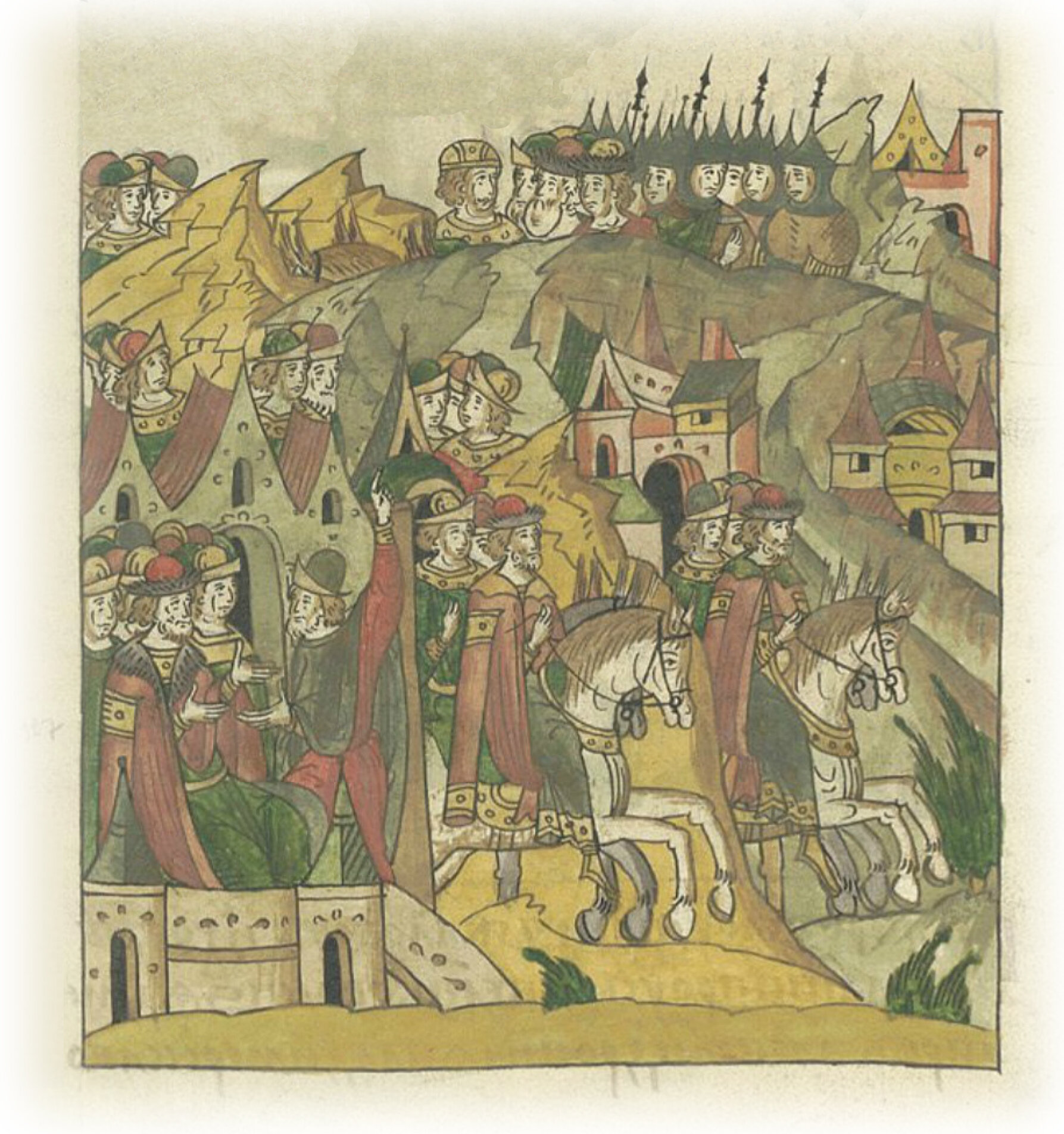 А князь великий Дмитрий Александрович был тогда в Переславле. Услышав же об этом, люди переславские разбежались все, также и сам князь великий Дмитрий Александрович с дружиною своею побежал к Волоку и оттуда к Пскову; и так пришла в смятение вся земля Суздальская.