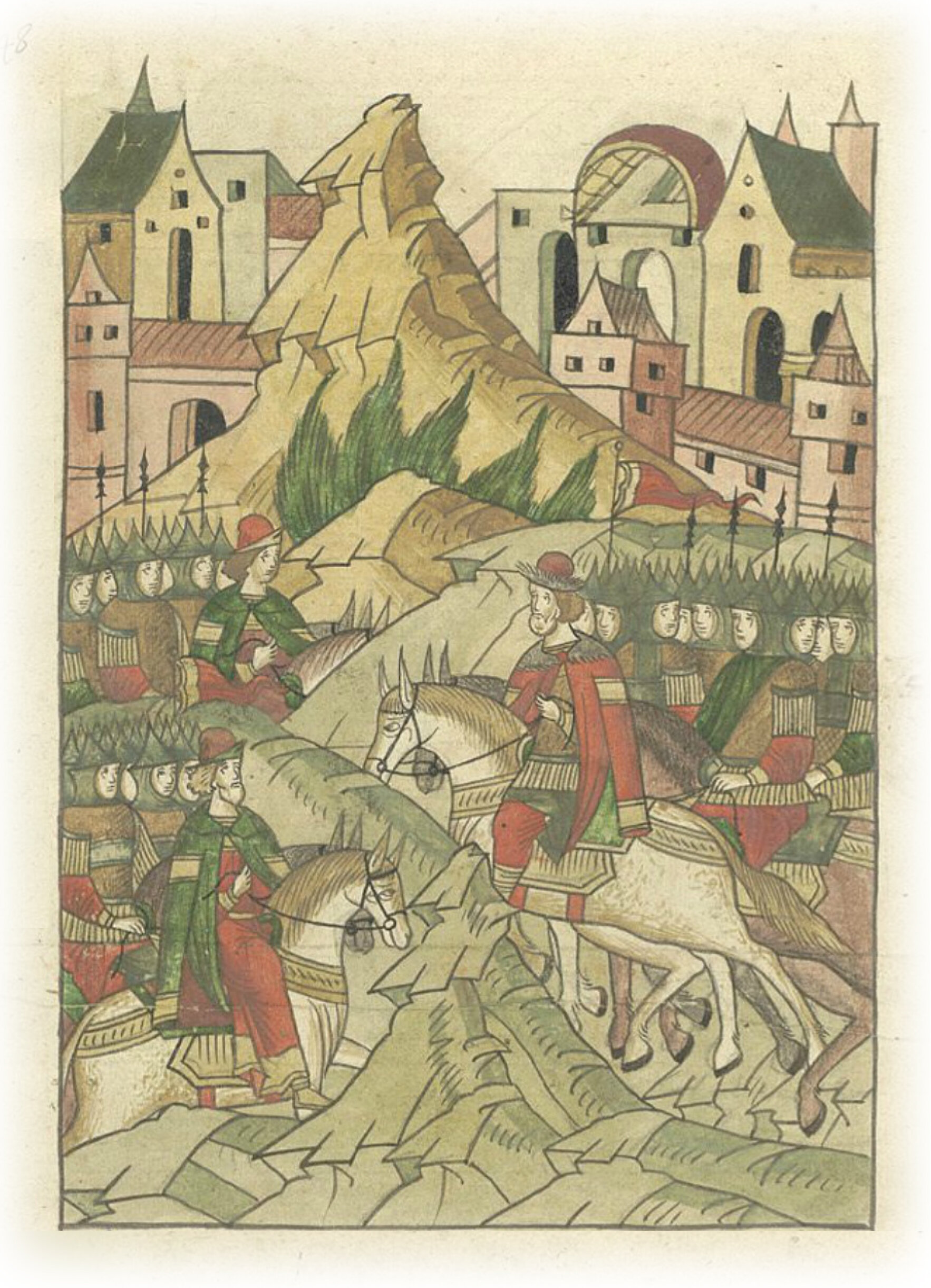 Князь Олег Иванович Рязанский с войском выходит навстречу напавшему на него великому князю Дмитрию Ивановичу.