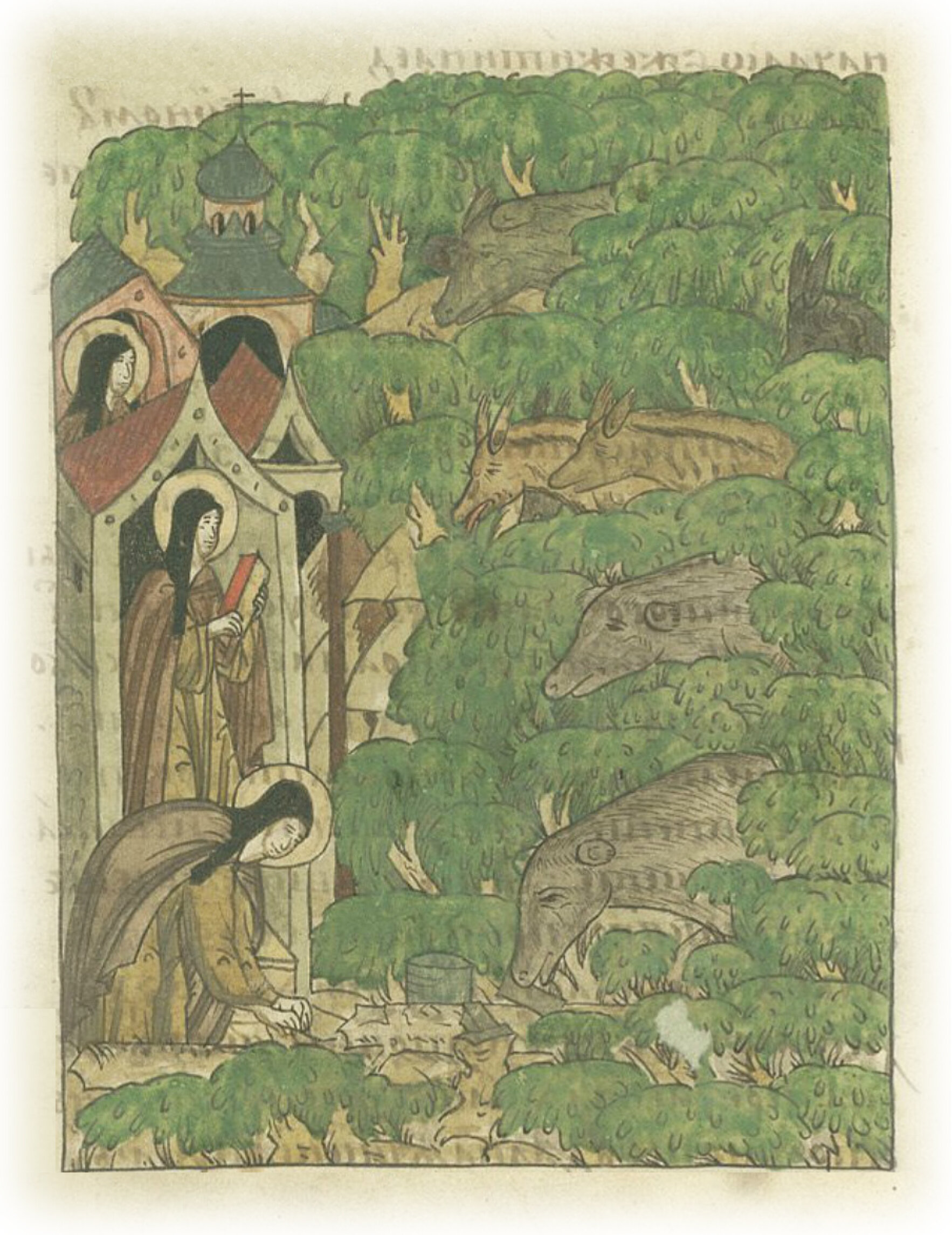 Повесть о преподобном Сергии Радонежском. Сергий подкармливает приходящих к нему животных.