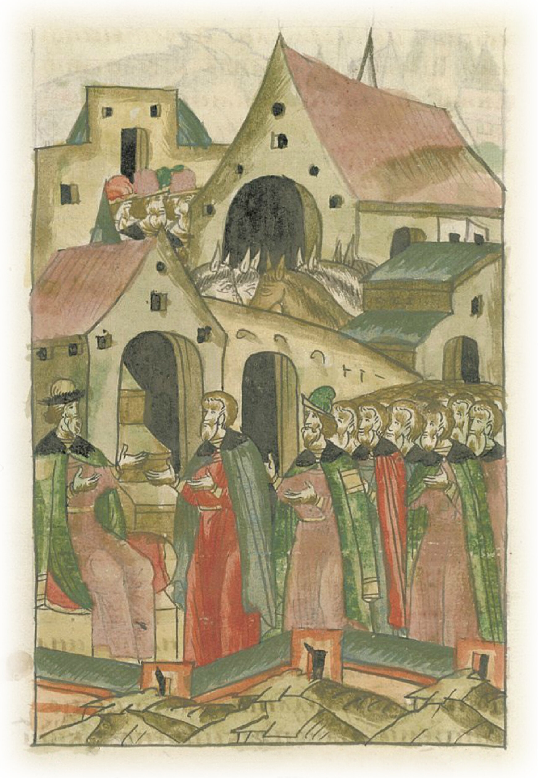 Никифор Басенков с послом царя Большой Орды Ахмета Кара-Кучуком и множеством татар приходит к великому князю.