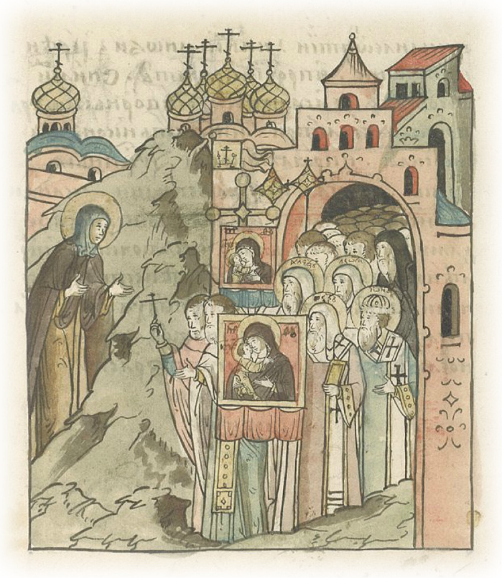 Была некая слепая инокиня, которая в добродетелях провела много лет до самой старости, живя в девичьем монастыре Вознесения Христа, где великие княгини постригались и погребались. Случилось это тогда, когда все люди молились, как было выше сказано, и эта инокиня прилежно обращалась с молитвами к Богу об избавлении настоящей сей скорби. И вдруг услышала, будто раздался шум громкий, вихрь страшный и звон площадных колоколов, и Божественным мановением восхищена была умом, иоказалась вне монастыря. И открылись очи ее мысленные вместе с чувственными. Видение собора святительского и прочих. И увидела великое и дивное видение, не как во сне, но как будто наяву: вот, идут из города через Фроловские ворота многобесчисленный световидный собор святолепных мужей в освященных одеждах, многие митрополиты и епископы. Среди них ею были узнаны: великие чудотворцы Петр и Алексий, Иона и Леонтий Ростовскй, и иные многие иереи и дьяконы, и прочие причетники, которые несли сами чудотворный образ пречистой Богоматери, икону Владимирскую, и другие иконы, и честные кресты, и Евангелия, и прочие святыни. (Они шли) с кадилами и со свечами, и с лампадами, и с рипидами, и с хоругвями, и все по чину, как дóлжно совершаться действу во время литии, то есть на крестных ходах. Следом же за ними шло бесчисленное множество народа всякого возраста, мужского пола и женского.