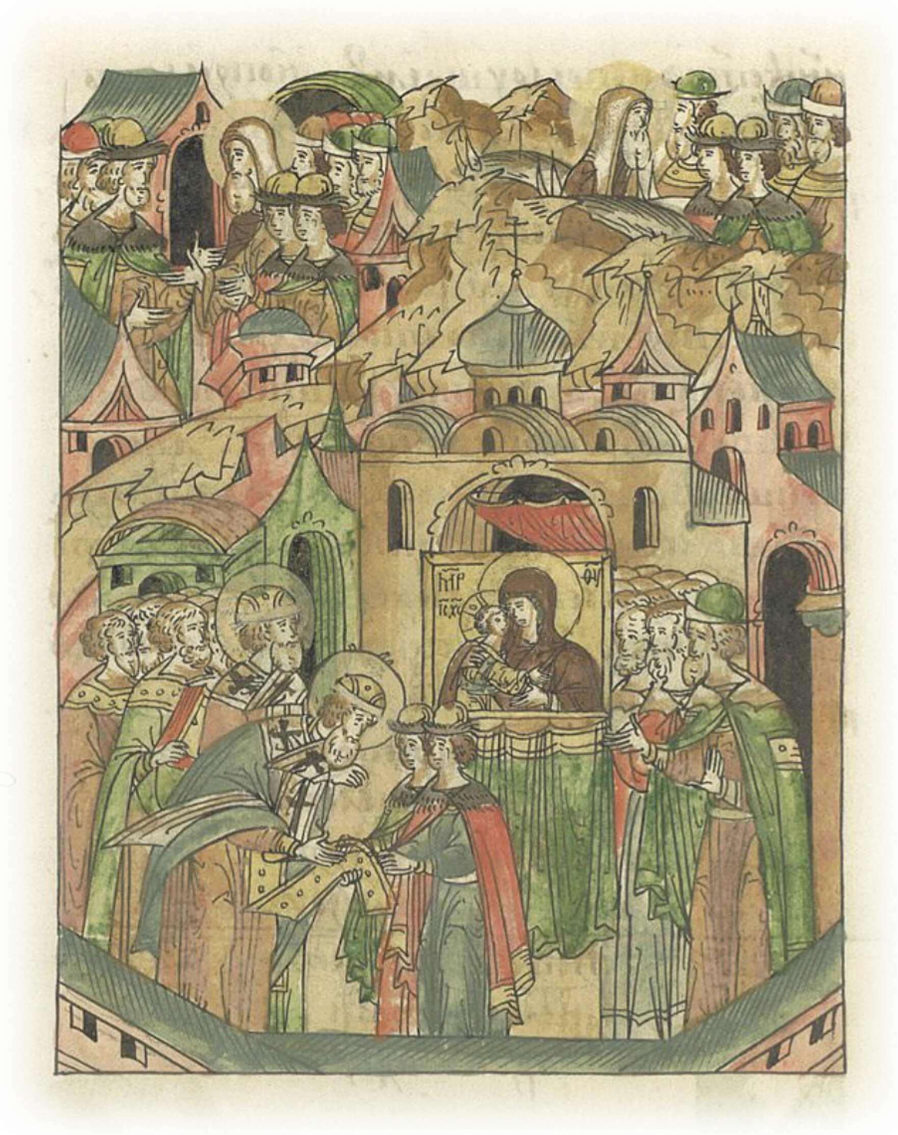И, войдя в церковь, начал молебен Пречистой, и, совершив молебен, взял их из пелены у Пречистой на свою епатрахиль, и пошел с ними в Переяславль к князю Дмитрию, который там был тогда. Пришел же он в Переяславль месяца мая в 6 день.