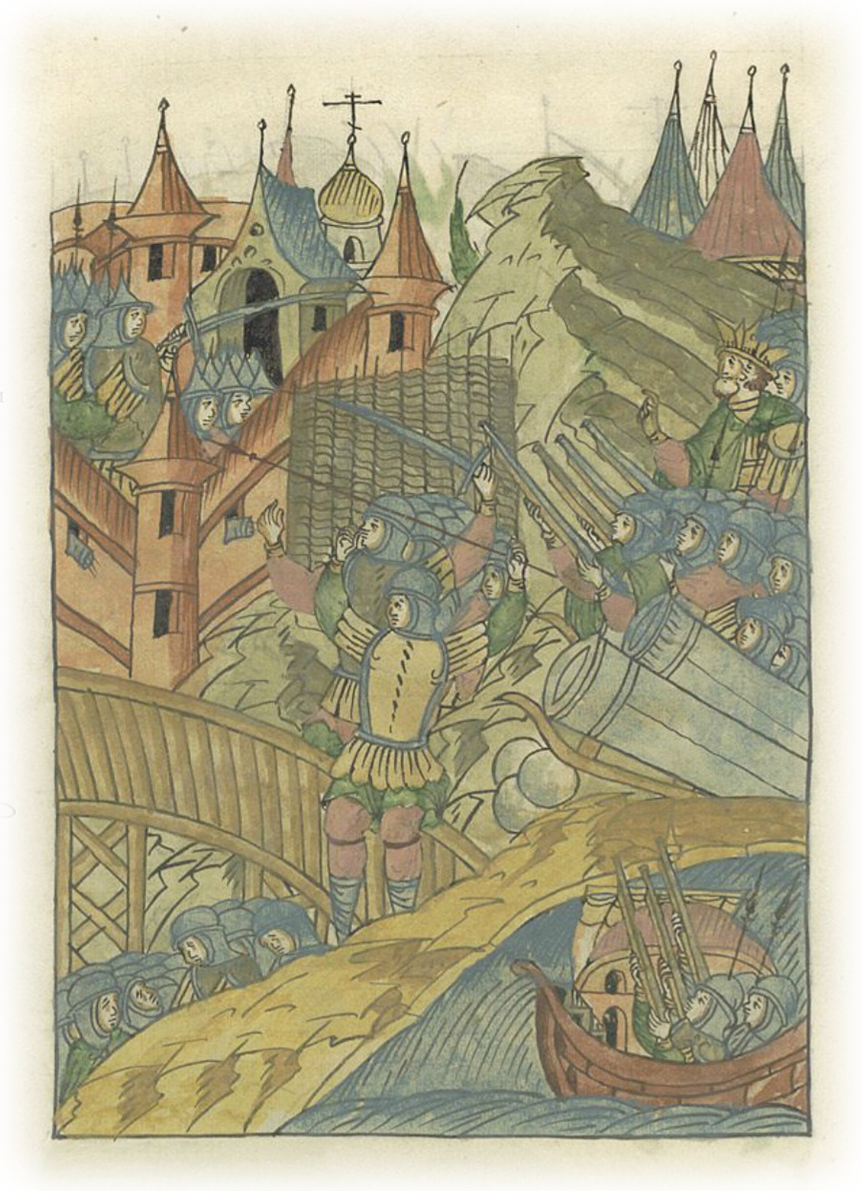 Языки говорят воеводам царя Ивана Васильевича, что магистр окопался большим рвом вокруг города Рындола, бьет из пушек и пищалей и приступает к Рындолу.