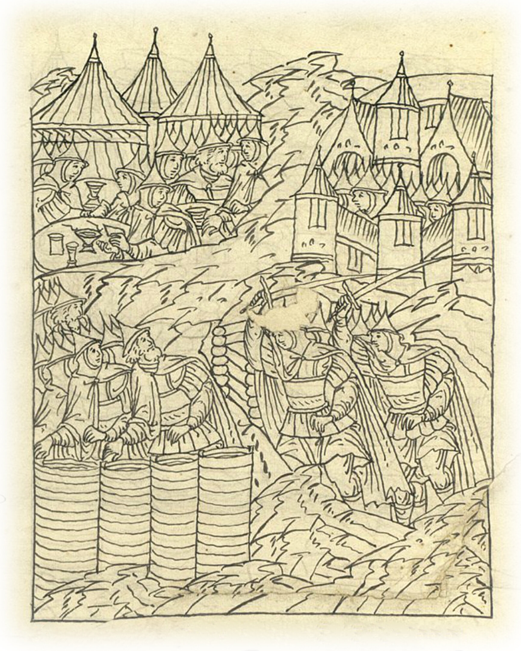 Языки говорят воеводам царя Ивана Васильевича, что магистр окопался большим рвом вокруг города Рындола, бьет из пушек и пищалей и приступает к Рындолу.