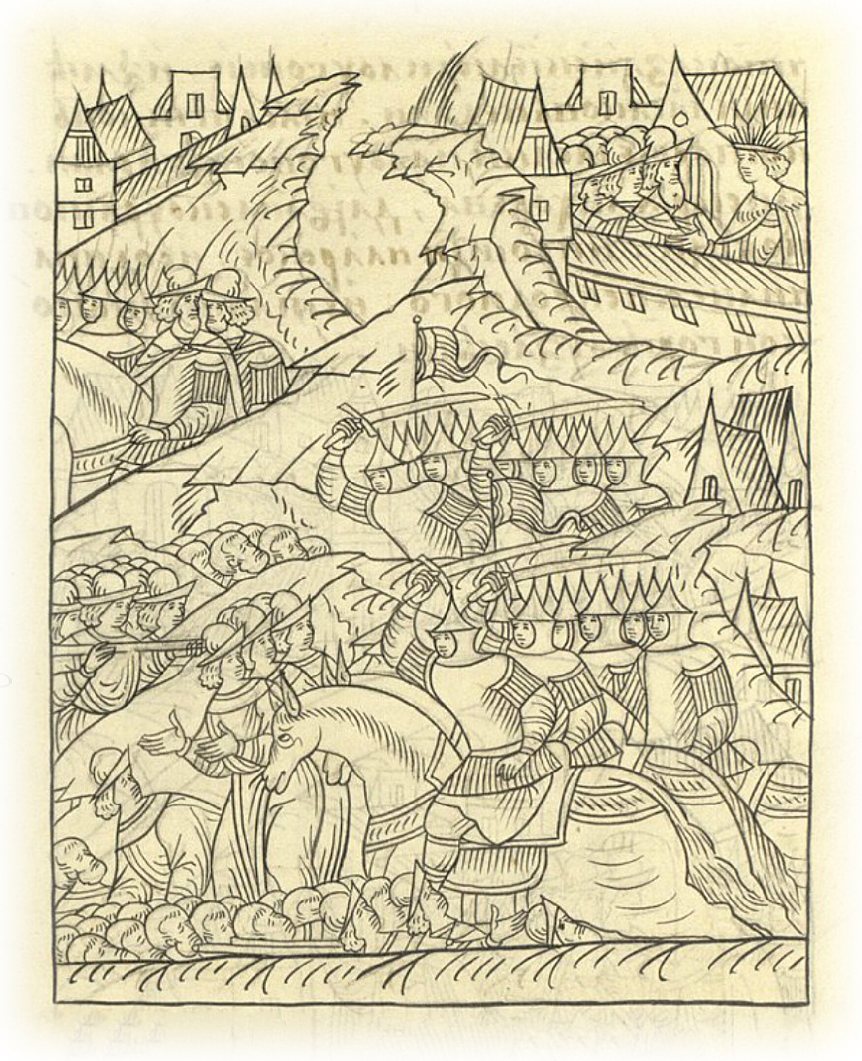 Языки говорят воеводам царя Ивана Васильевича, что магистр окопался большим рвом вокруг города Рындола, бьет из пушек и пищалей и приступает к Рындолу.