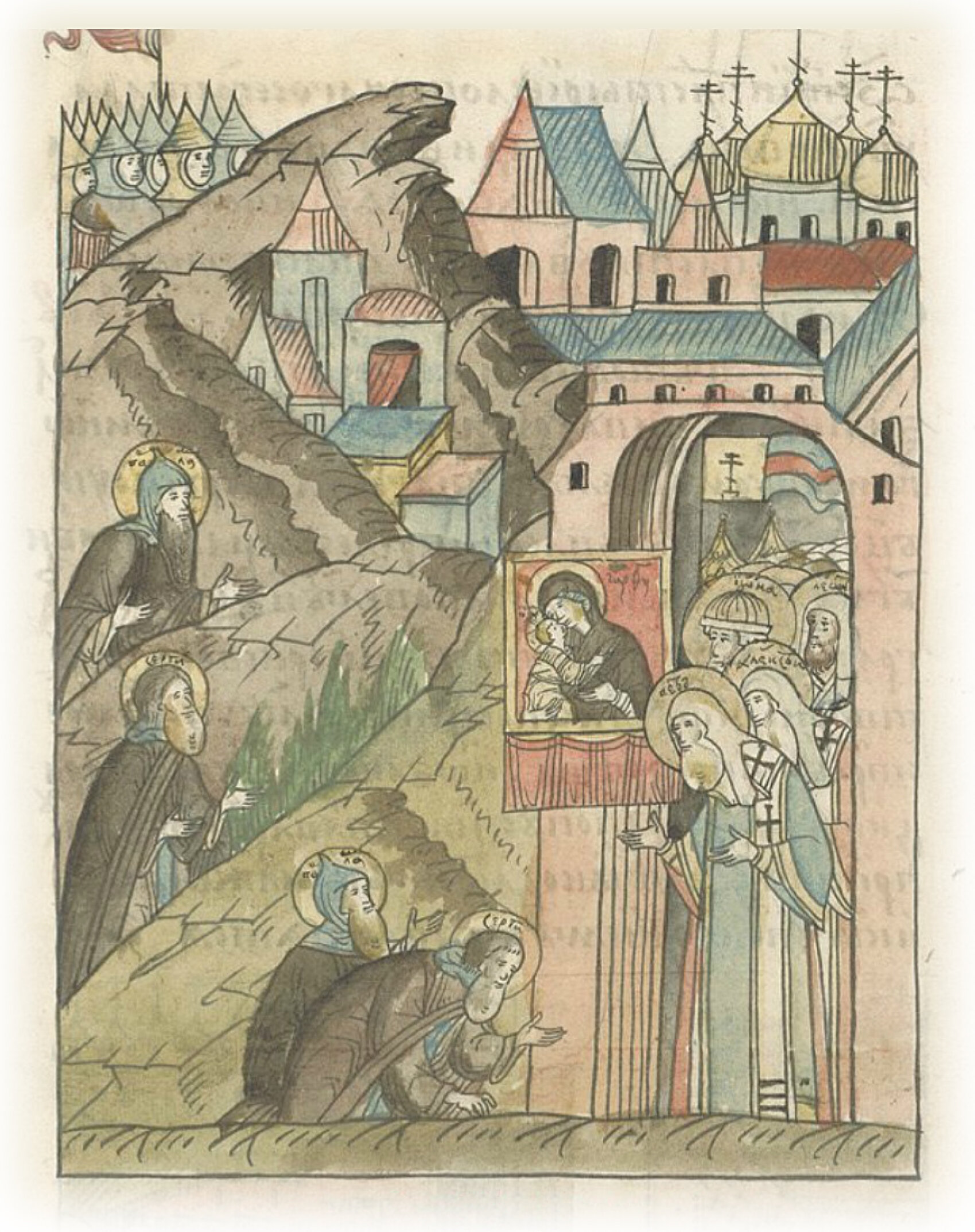 Преподобный Сергий и Варлаам. И тут от великого Ильинского торговища навстречу им быстро пошел великий в преподобных Сергий чудотворец, с другой стороны подоспел преподобный Варлаам, Хутынский чудотворец. Моление преподобных. Иэти оба преподобных, будто сговорившись, любезно припали к ногам великих этих святителей и молили их со слезами умильно, говоря: «О, святые пастыри словесного сего стада Христовых овец! Почему выходите из города сего и кому оставляете паству вашу во время варварского нашествия?»