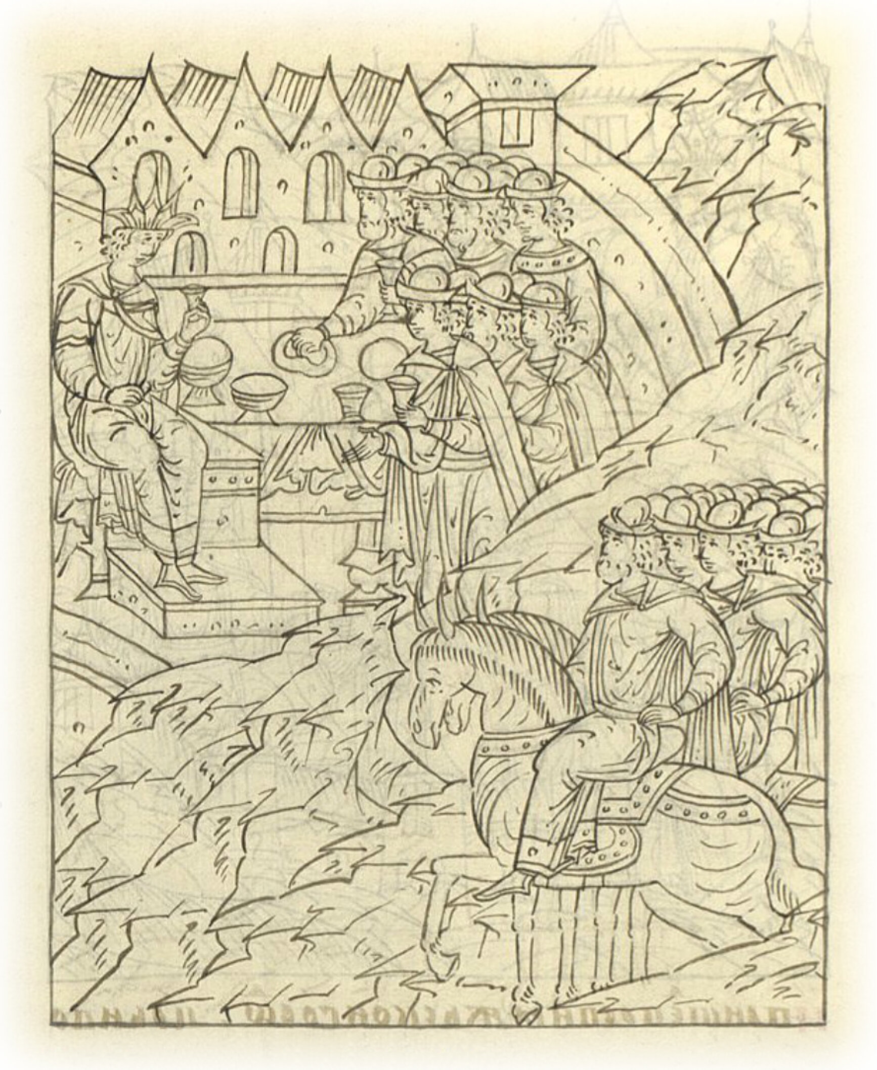 Ругодивские посадники Яким и Захар приезжают в Москву. Воеводы царя Ивана Васильевича Алексей Адашев и Иван Михайлов сообщают им, что государь пожалует их, если сдадут его воеводам помимо Ругодива Вышгород.