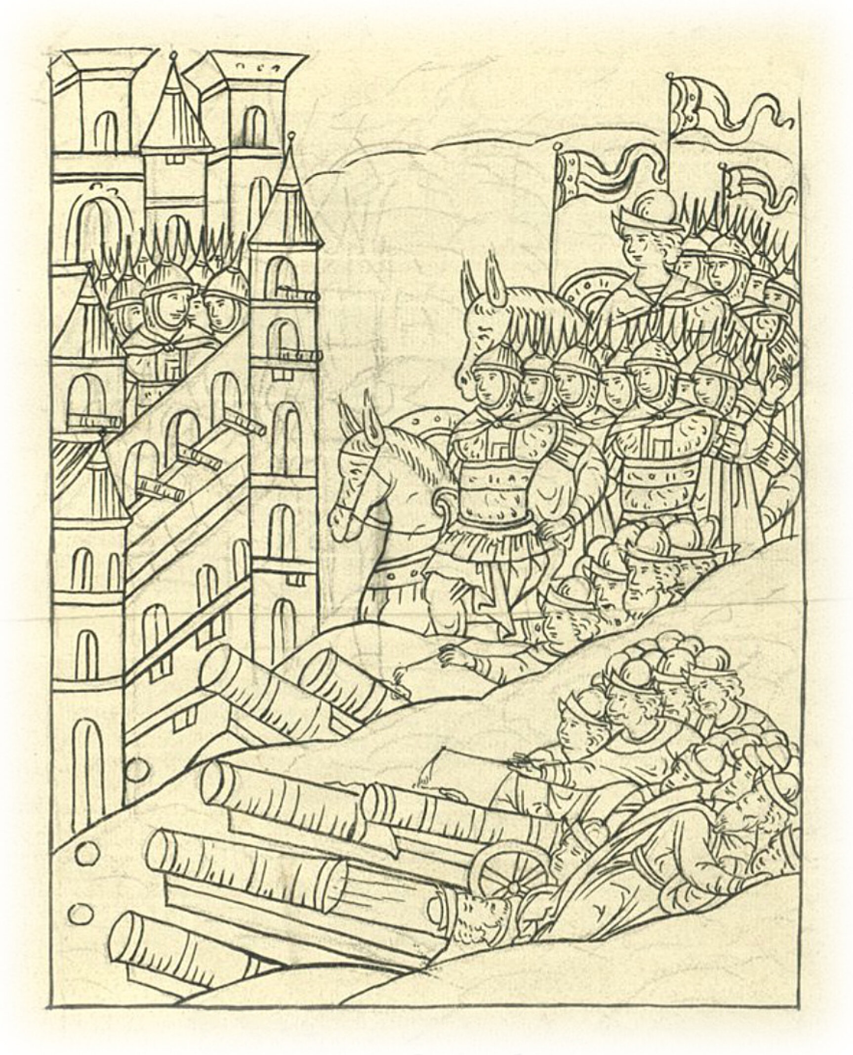 Языки говорят воеводам царя Ивана Васильевича, что магистр окопался большим рвом вокруг города Рындола, бьет из пушек и пищалей и приступает к Рындолу.