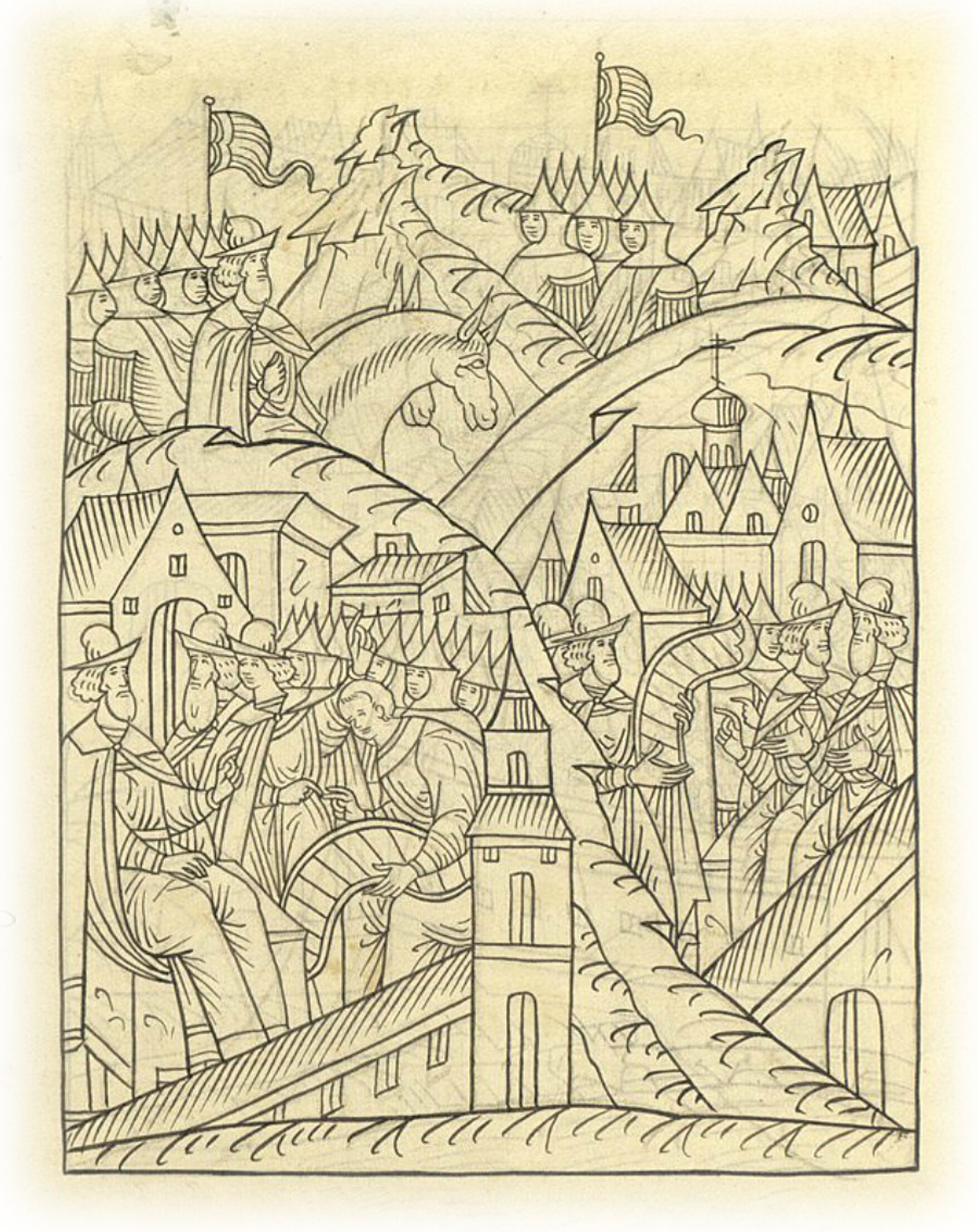 Языки говорят воеводам царя Ивана Васильевича, что магистр окопался большим рвом вокруг города Рындола, бьет из пушек и пищалей и приступает к Рындолу.