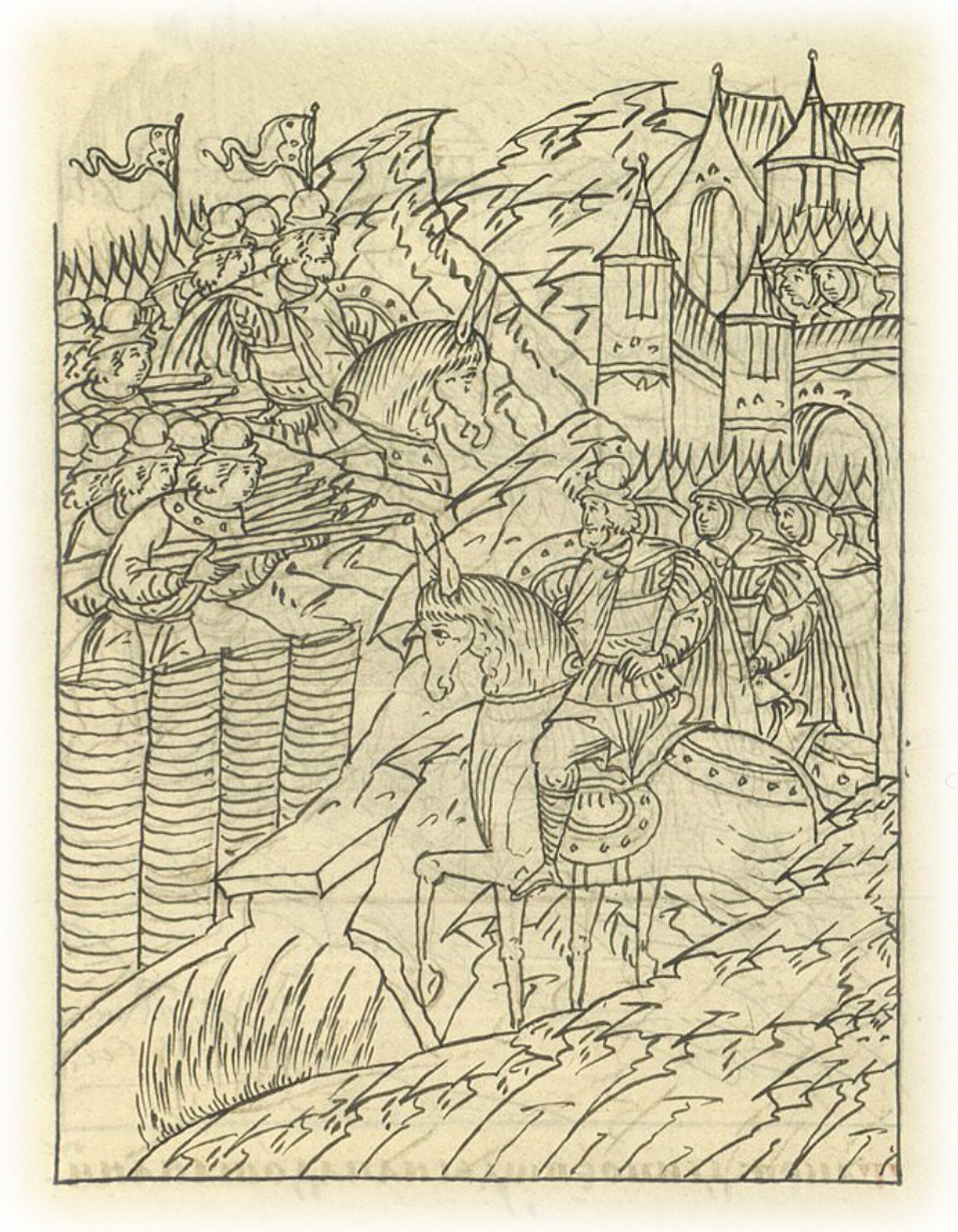 Языки говорят воеводам царя Ивана Васильевича, что магистр окопался большим рвом вокруг города Рындола, бьет из пушек и пищалей и приступает к Рындолу.