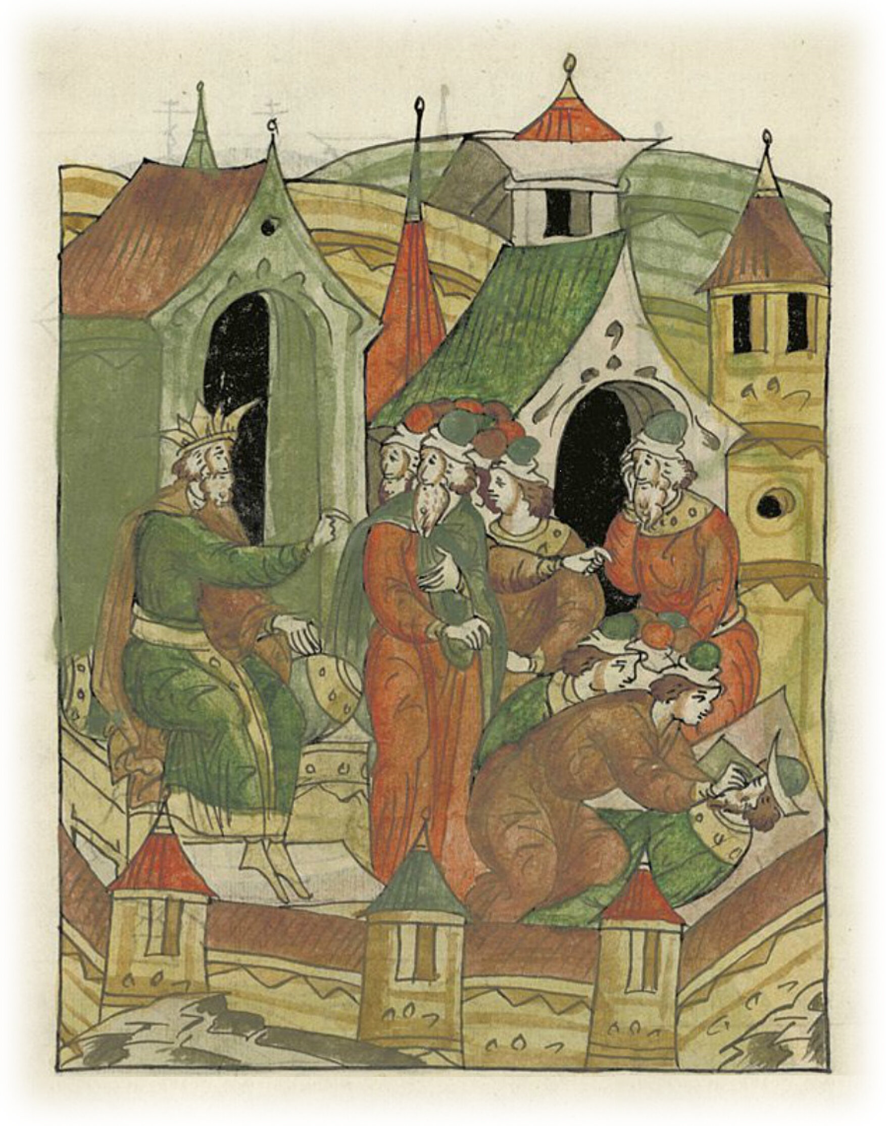 Ругодивские посадники Яким и Захар приезжают в Москву. Воеводы царя Ивана Васильевича Алексей Адашев и Иван Михайлов сообщают им, что государь пожалует их, если сдадут его воеводам помимо Ругодива Вышгород.
