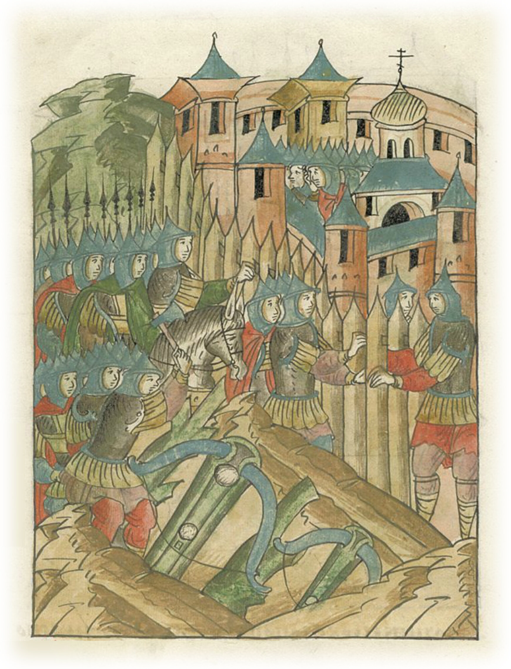 И пришли к Владимиру в субботу Мясопустную, и начали делать леса, и пороки ставить с утра до вечера, а на ночь огородили тыном весь город.