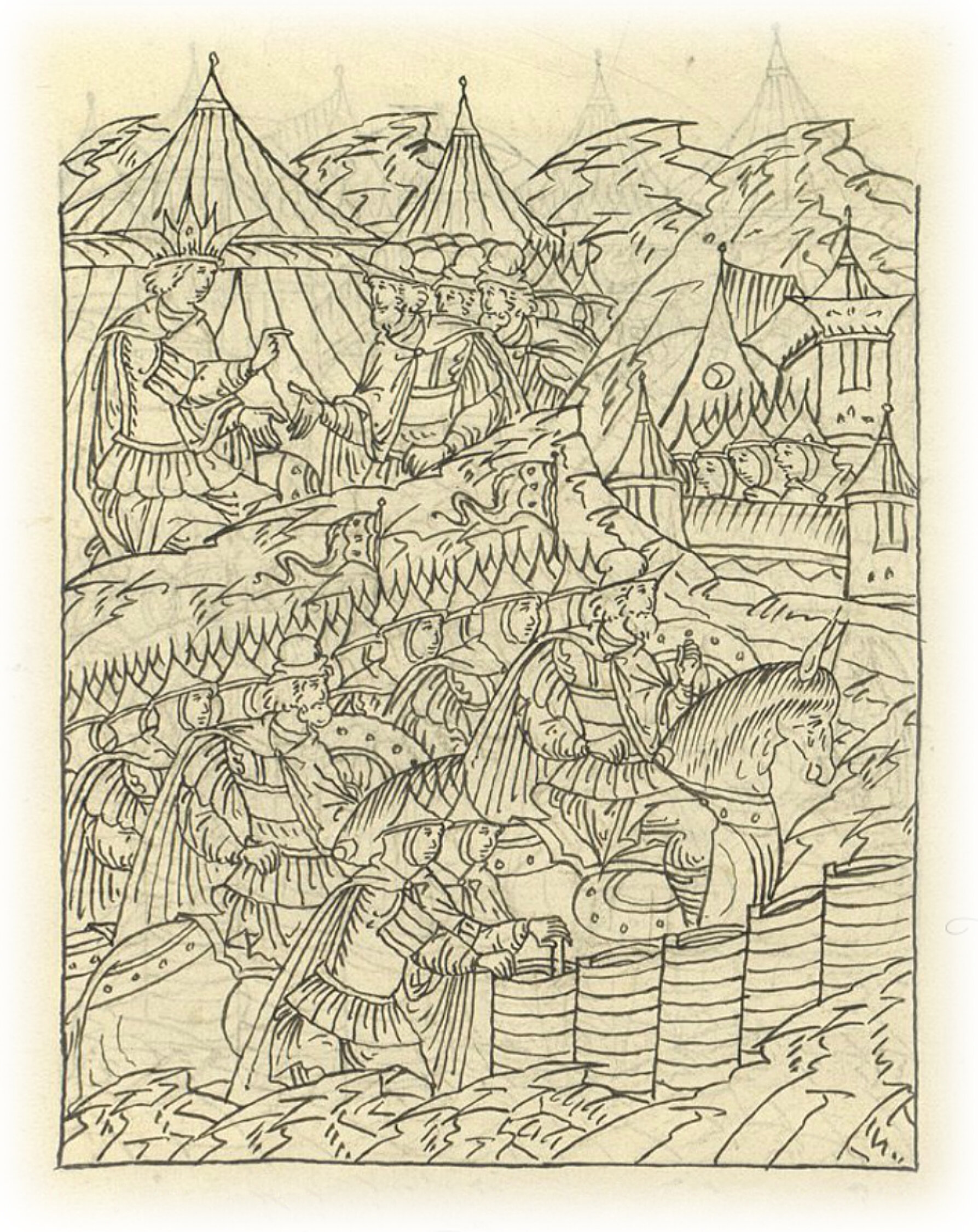 Языки говорят воеводам царя Ивана Васильевича, что магистр окопался большим рвом вокруг города Рындола, бьет из пушек и пищалей и приступает к Рындолу.
