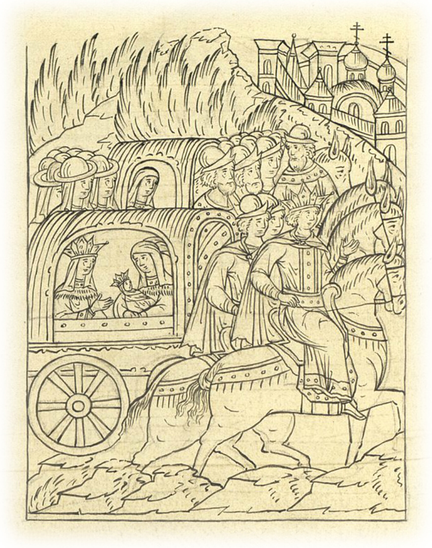 И вскоре государь с царицей и новорожденным своим младенцем царевичем князем Дмитрием пошли в обитель живоначальной Троицы и Сергия чудотворца, чтобы просветить новорожденного своего младенца святым крещением.