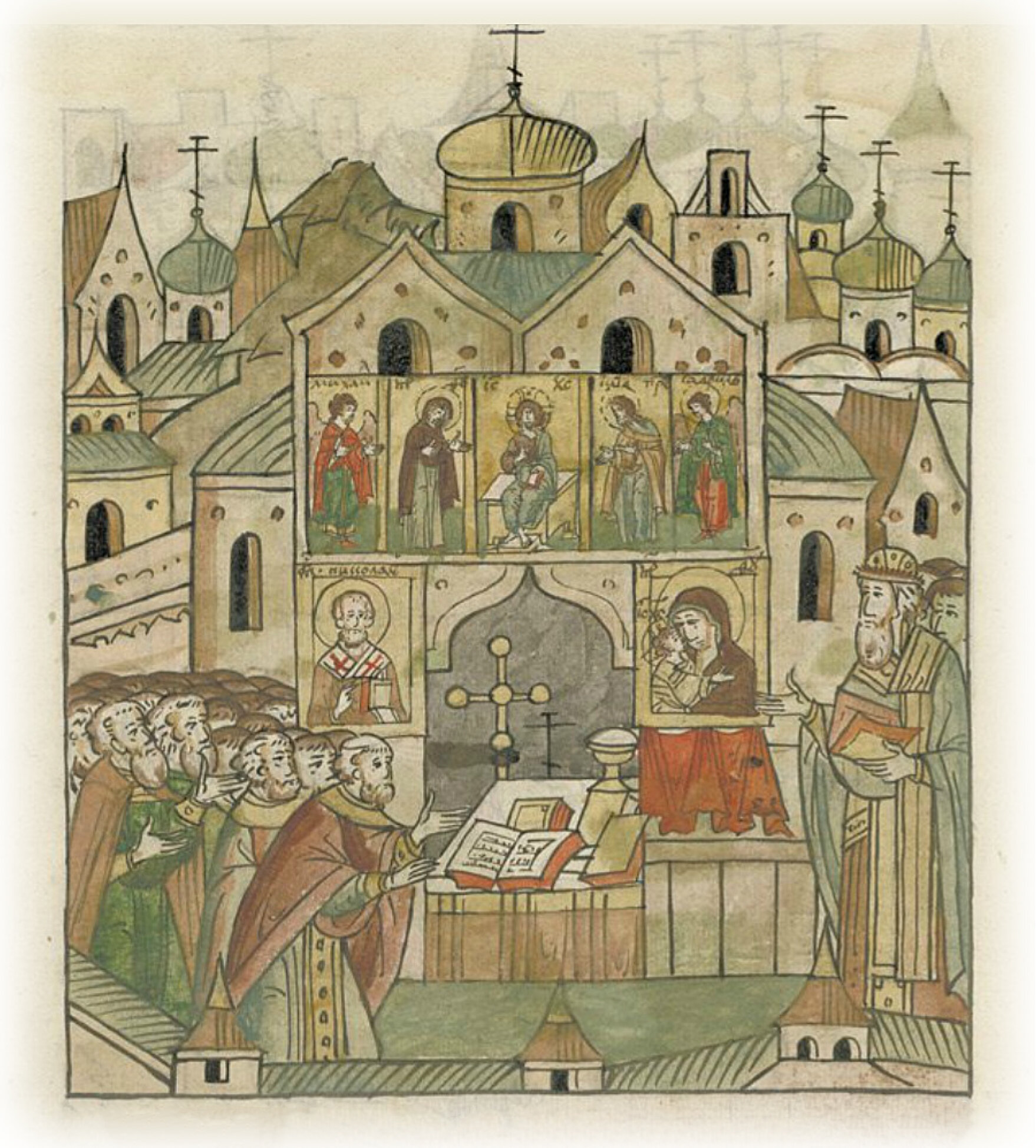 Священники всего города по благословению архиепископа Макария кладут Евангелие-тетр в святом алтаре, а церковь украшают иконами, крестами и священными книгами.