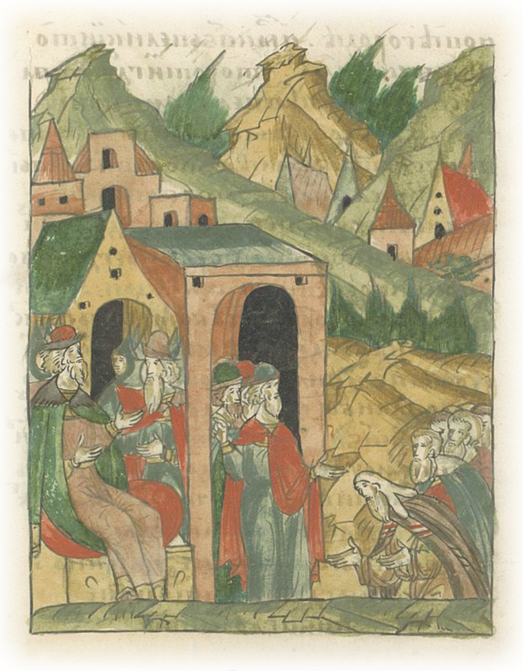 Бояре передают новгородцам ответ великого князя Ивана Васильевича. Ответ владыки, посадников и зажиточных горожан великому князю.