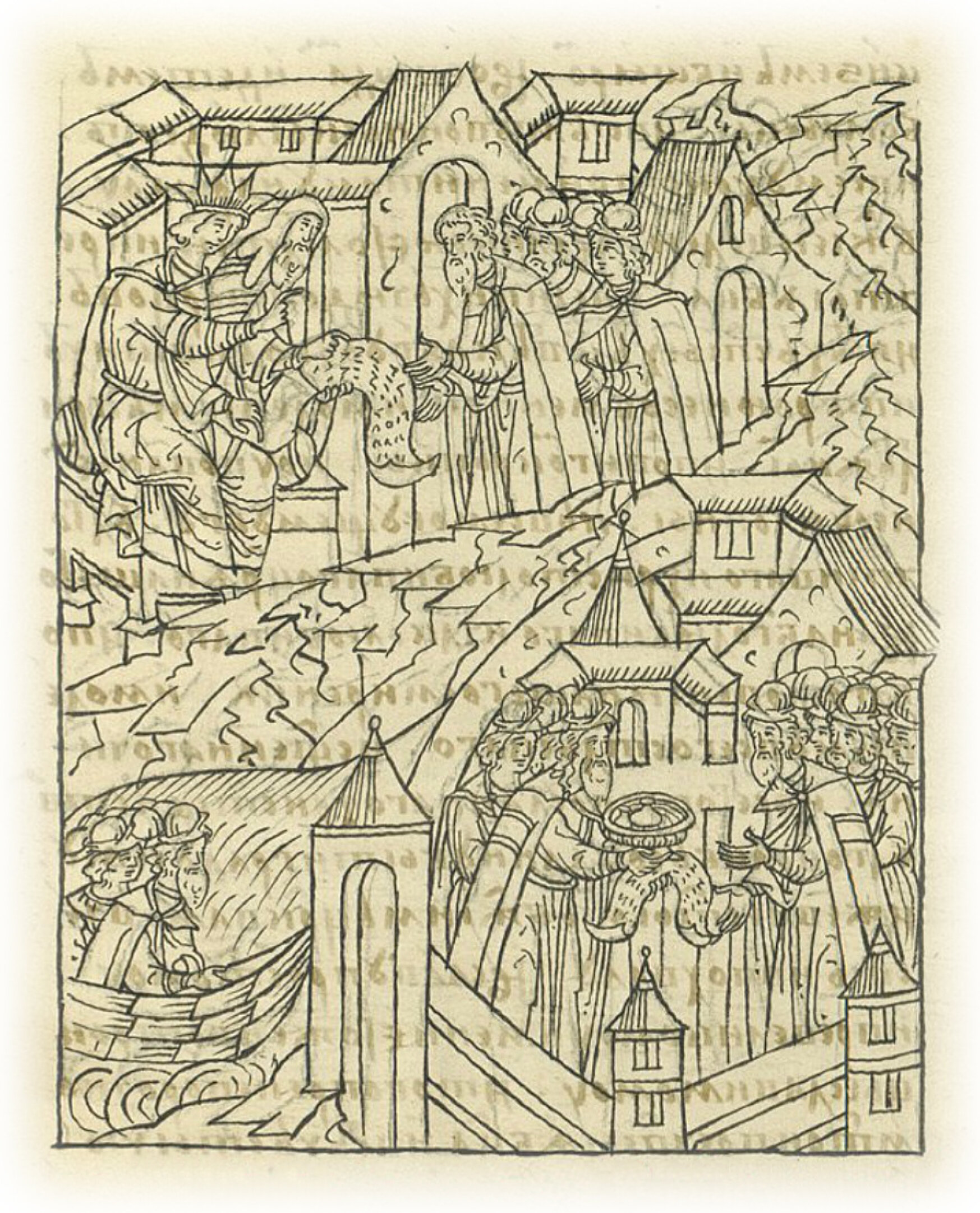 Ругодивские посадники Яким и Захар приезжают в Москву. Воеводы царя Ивана Васильевича Алексей Адашев и Иван Михайлов сообщают им, что государь пожалует их, если сдадут его воеводам помимо Ругодива Вышгород.