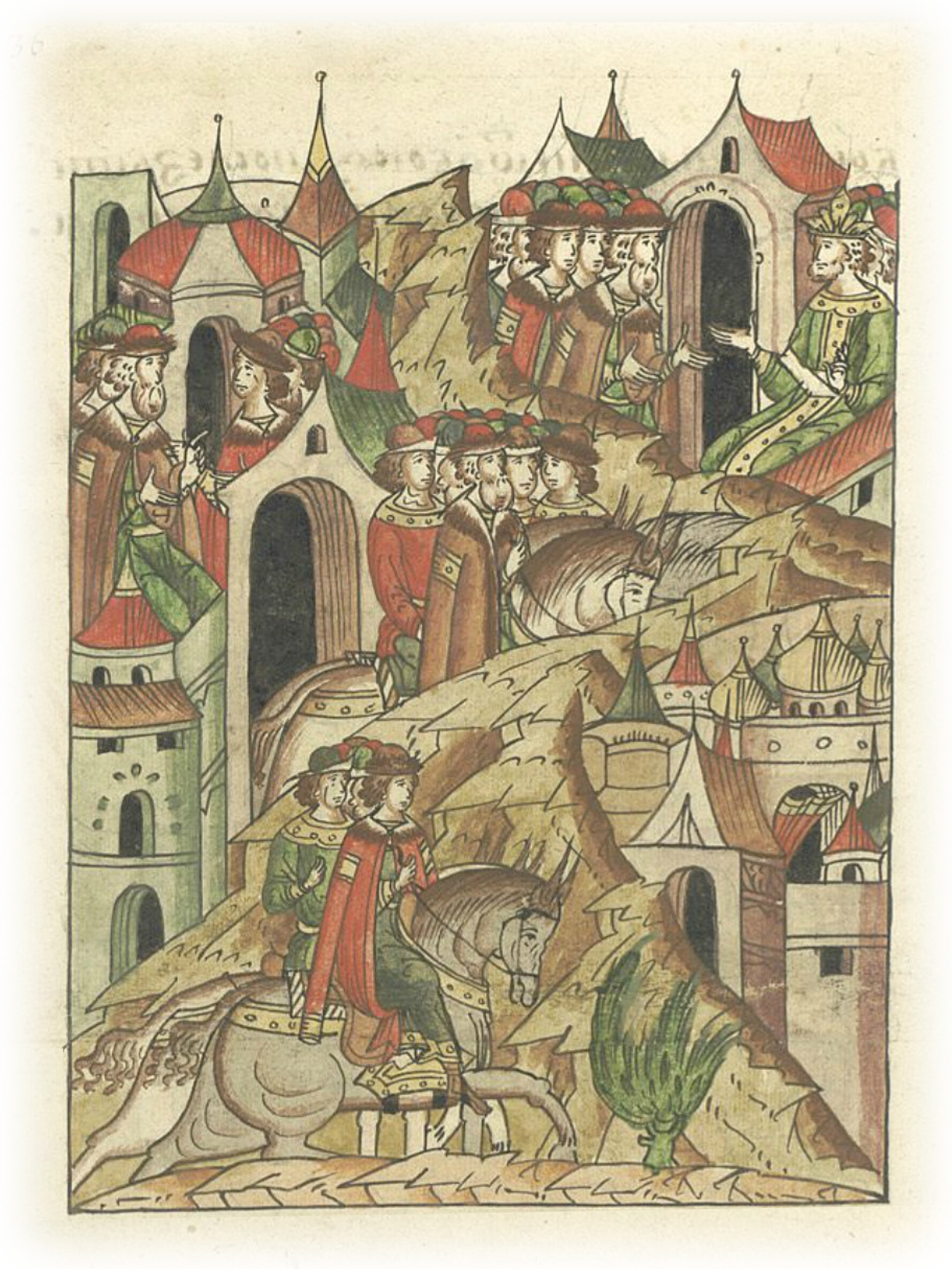 Великий князь Иван Данилович Калита с сыновьями Семеном и Иваном идет в Орду, а третьего сына Андрея посылает в Новгород. Царь Азбяк принимает князей с честью.