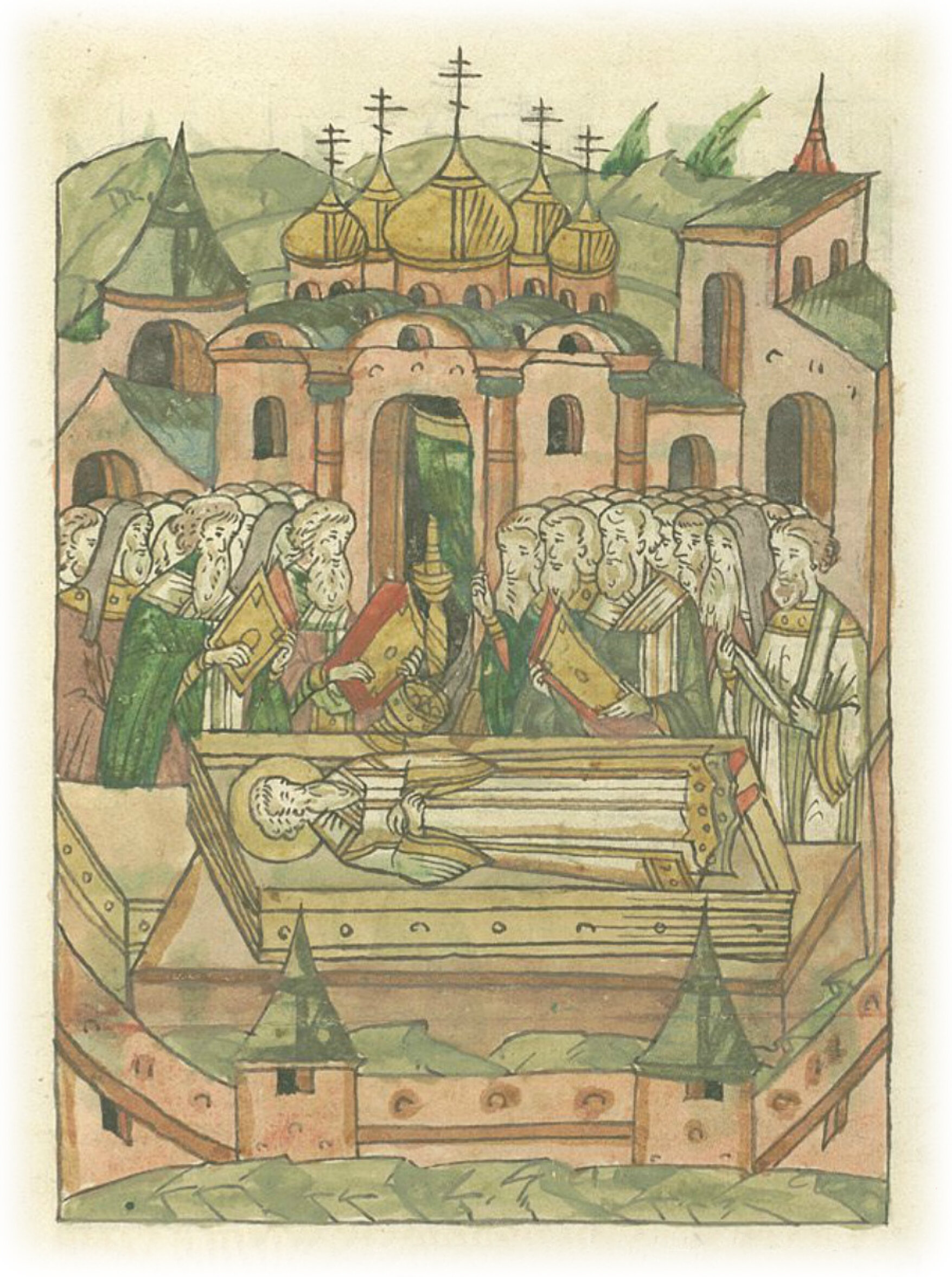 И служил над его телом освященный божественный собор: Григорий, архиепископ Ростовский; Митрофан, епископ Суздальский; Иларион, епископ Коломенский, с архимандритами, игуменами и со всем освященным собором, пели над телом надгробные песнопения.