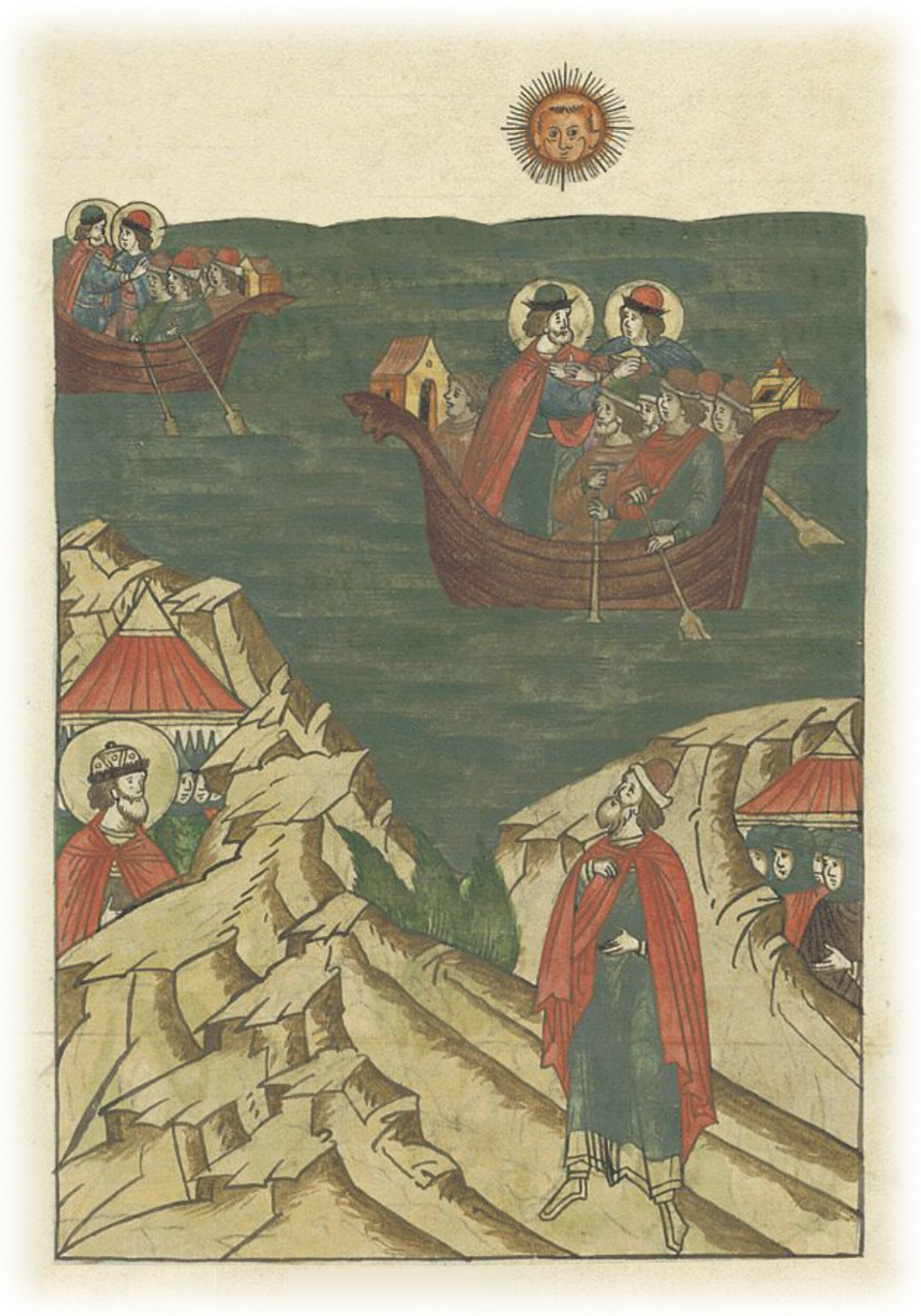 Стоял он на берегу моря, наблюдая за обоими путями и проводя всю ночь без сна. И когда начало восходить солнце, услышал страшный шум на море и увидел одинокий насад, плывущий (по морю). Посреди же насада стояли святые мученики Борис и Глеб в одеждах красных и руки свои держали на плечах своих, гребцы же в насадах сидят, словно мглою одеты. И говорит Борис Глебу: «Брат Глеб! Вели грести спешно, поможем сроднику своему, великому князю Александру Ярославичу». Увидев таковое видение и услышав голоса святых мучеников Бориса и Глеба, Пелгусий стоял в трепете и в ужасе великом до тех пор, пока насад не скрылся из очей его (в сторону Валаама).