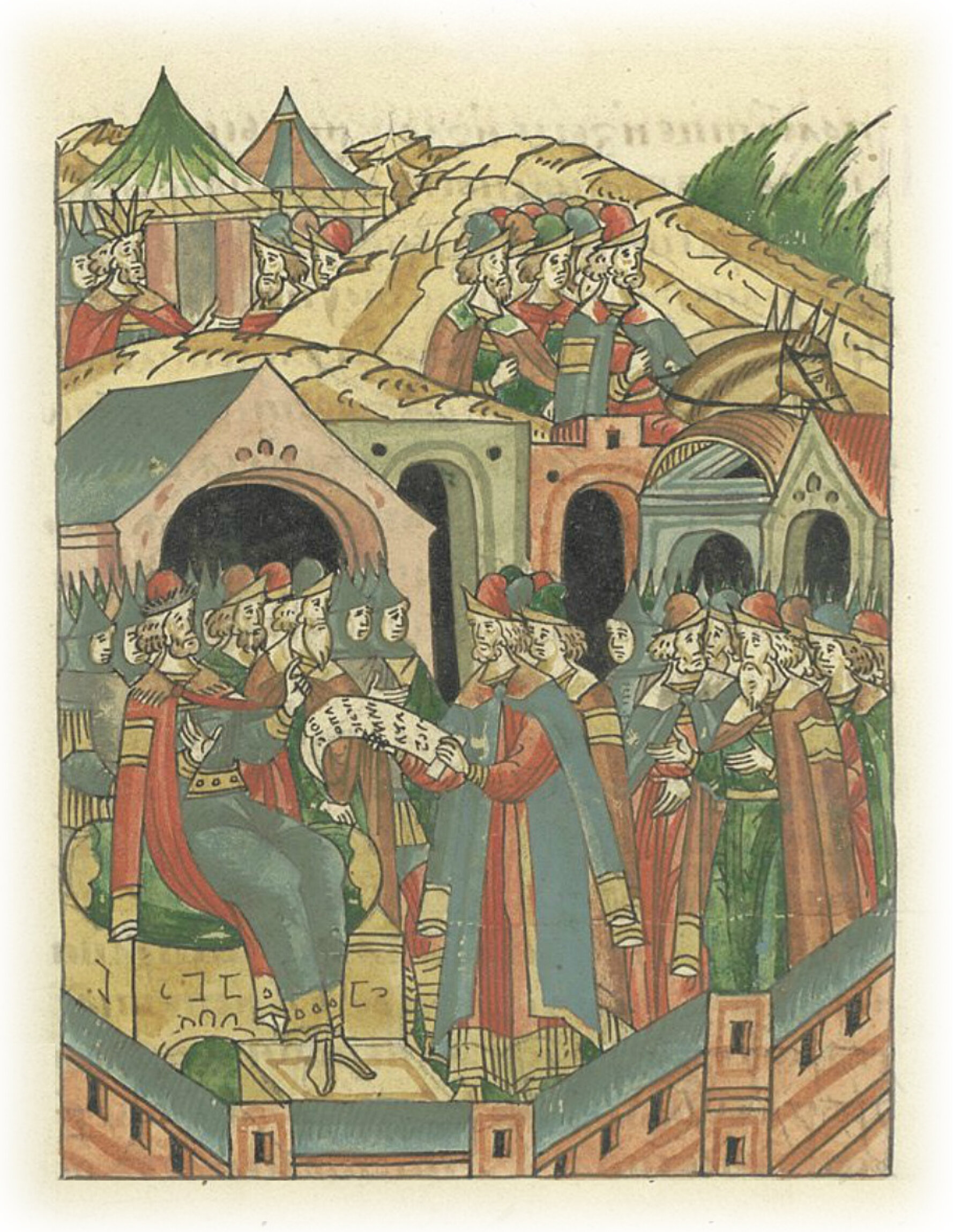 Послы Мамая приходят к великому князю Дмитрию Ивановичу и просят такой же дани, как была при царе Азбяке и его сыне Чянибеке, а не по мирному договору, как князь платил.