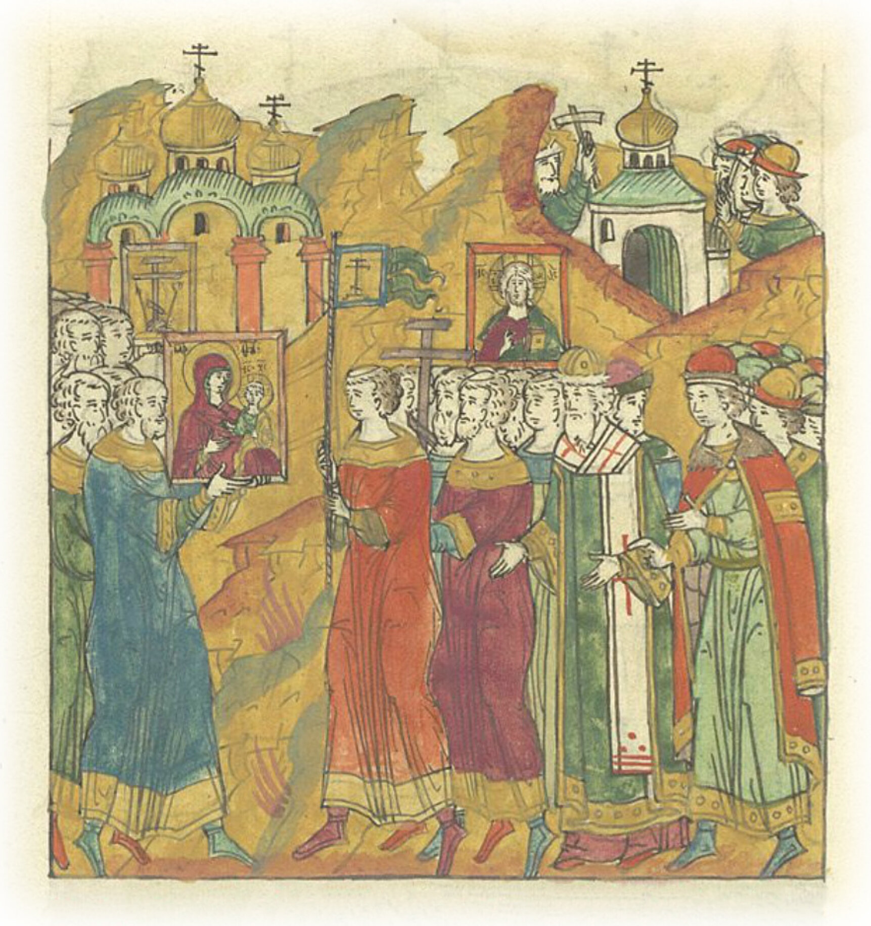 В 7048 (1540) году в феврале в третий день. Принесены были из Ржева в Москву две иконы чудотворные: образ Пречистой Одигитрии, а другая икона – Крест Честный. И встретили чудотворные иконы с крестами преосвященный Иоасаф митрополит со всем освященным собором, и князь великий Иван Васильевич всея Руси с братом своим, с князем Юрием, и с боярами, и со всем народом близ Нового монастыря митрополичьего. И повелел князь великий на том месте церковь поставить во имя пречистой Богородицы.