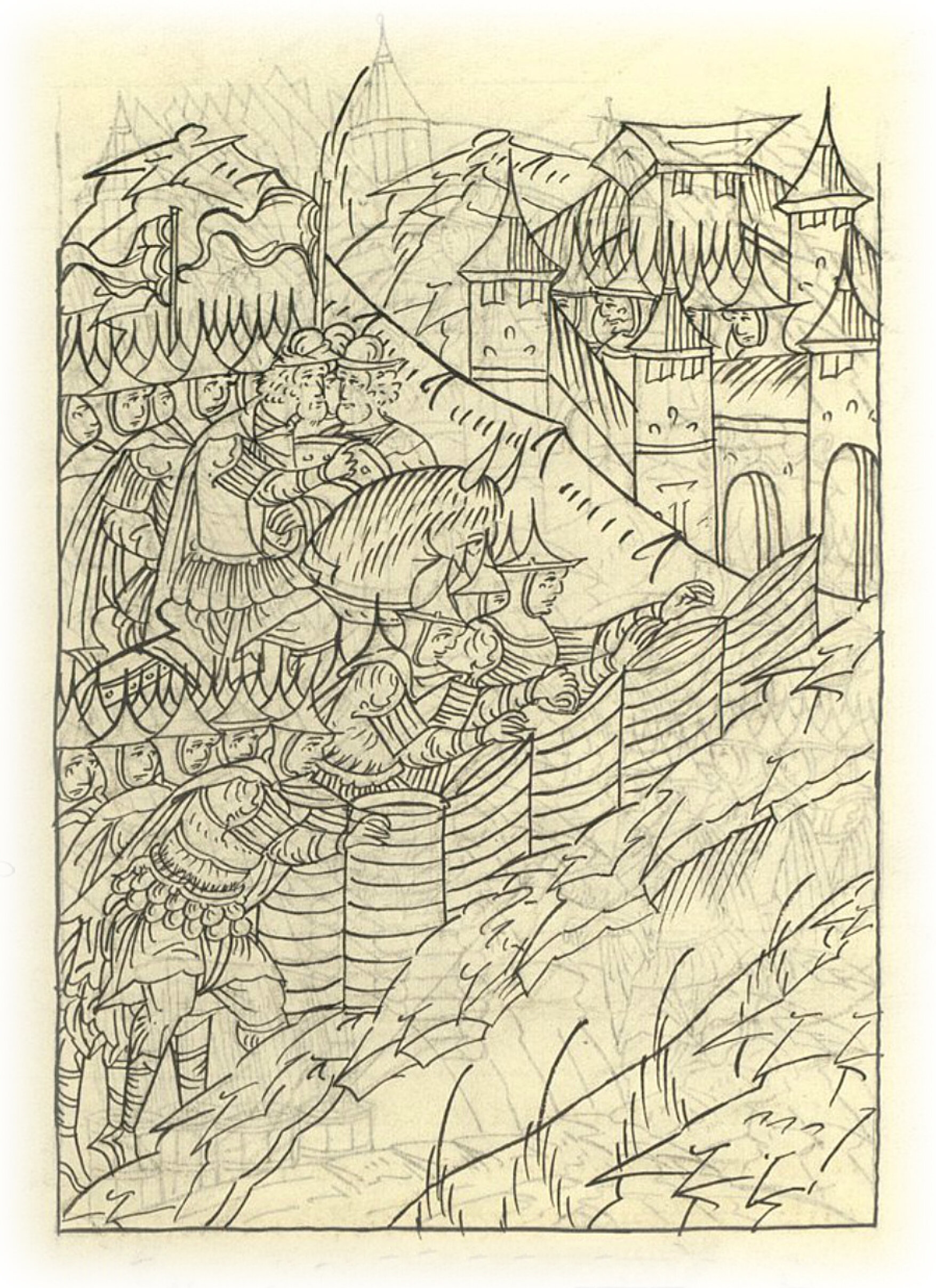 Языки говорят воеводам царя Ивана Васильевича, что магистр окопался большим рвом вокруг города Рындола, бьет из пушек и пищалей и приступает к Рындолу.