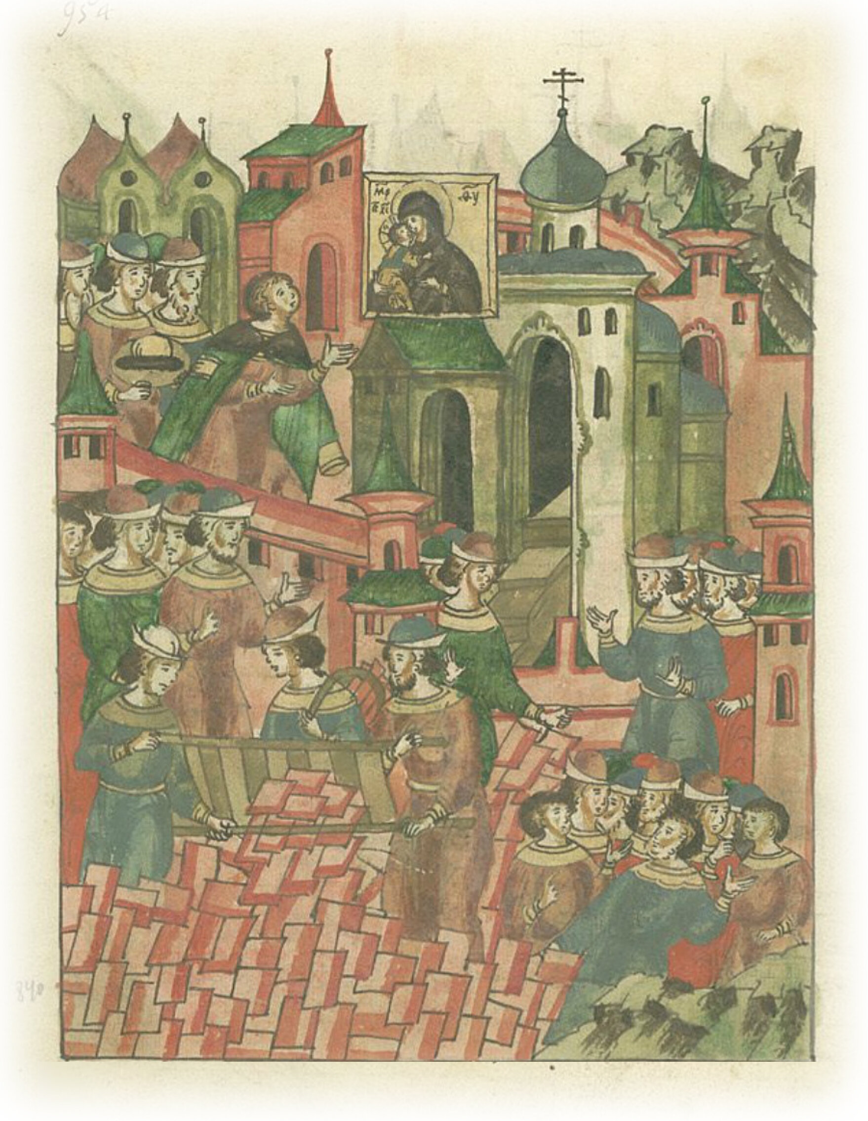 Чудо о золотых воротах. Только построенные ворота падают, и под камнями засыпает двенадцать человек. Князь Андрей Боголюбский припадает к чудотворному образу Богоматери, и оказывается, что никто из этих людей не пострадал.
