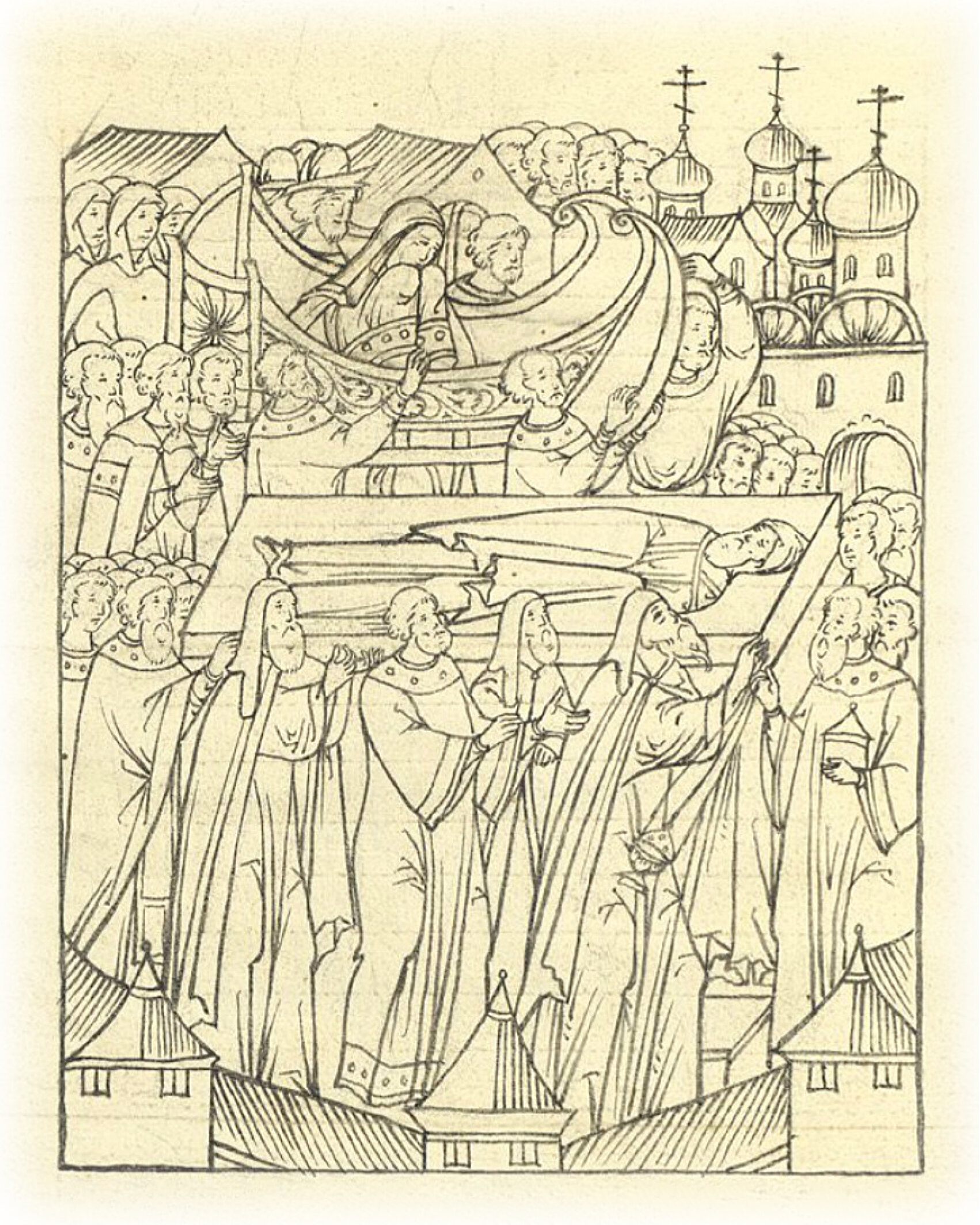 Боярские дети несут великую княгиню Елену из ее хором. С нею идут бояре и боярыни.