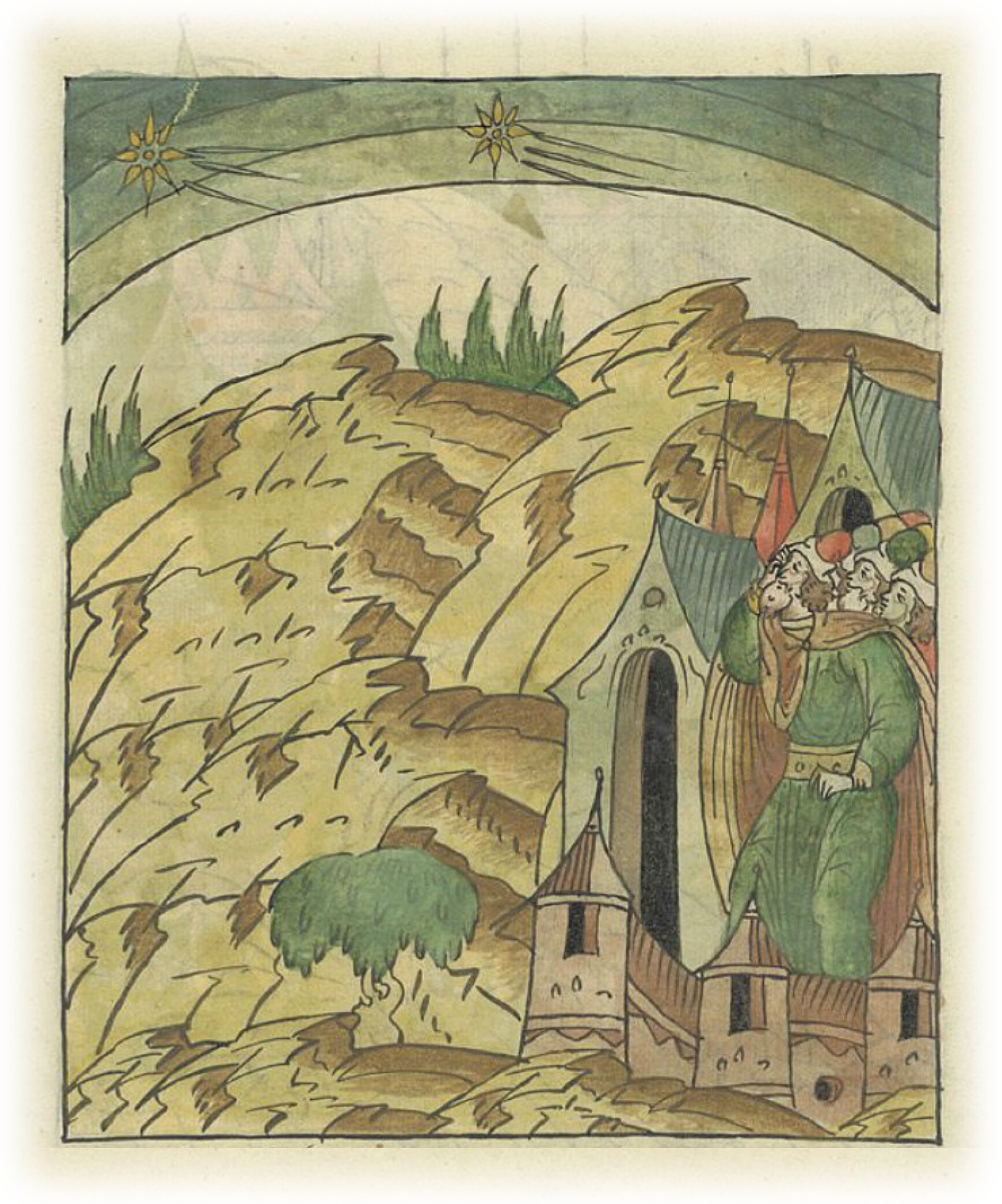 В том же году явилась звезда на западе, и были от нее лучи не напрямую, а к югу, всходила же она с вечера, по заходе солнца, и была величиной более всех иных звезд. И было так семь дней, и после седьмого дня появились лучи те к востоку, и так было четыре дня, а потом невидима стала.