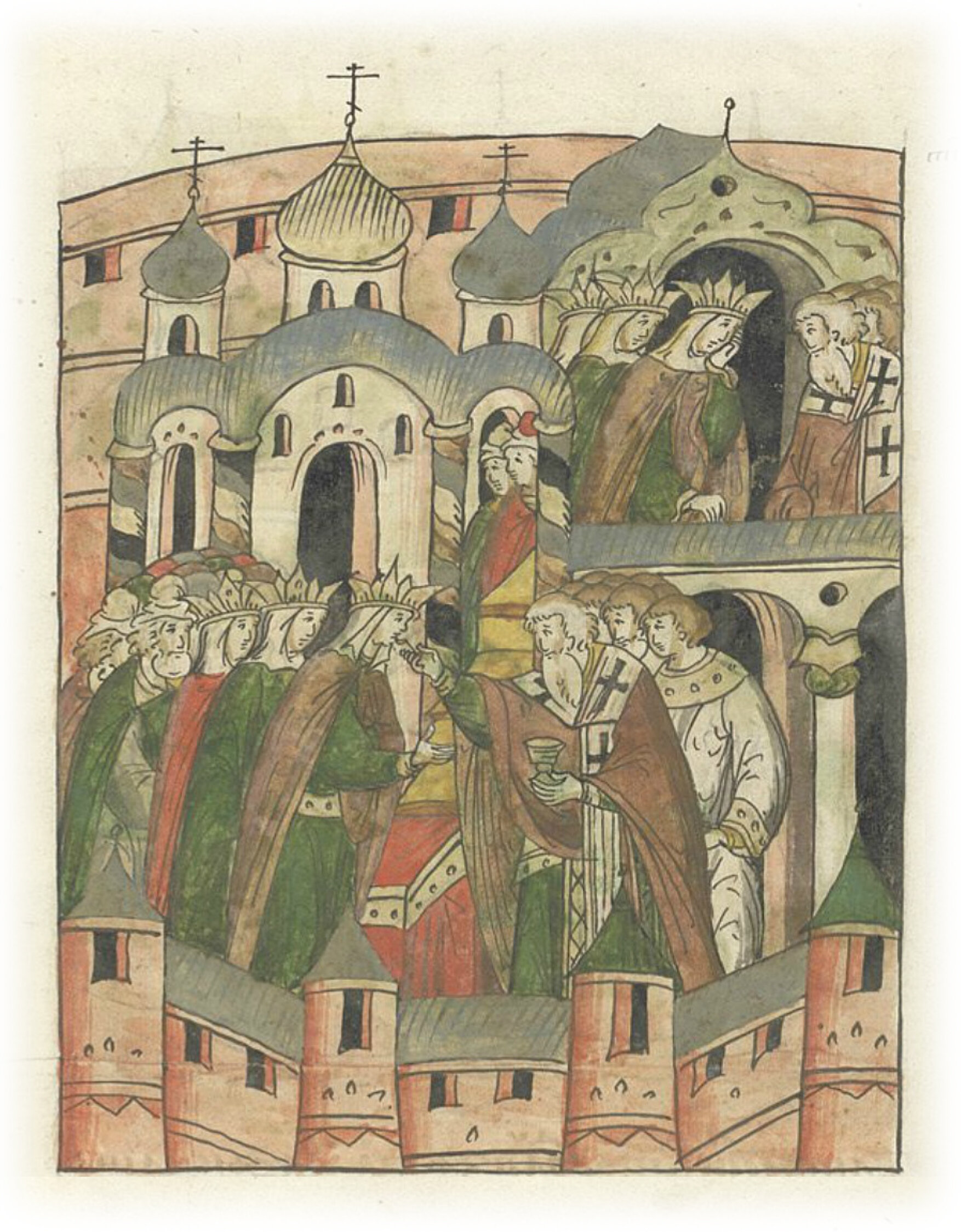 Владыка Митрофан с княгиней, детьми, внуками и многими другими людьми затворяются от татар в церкви.