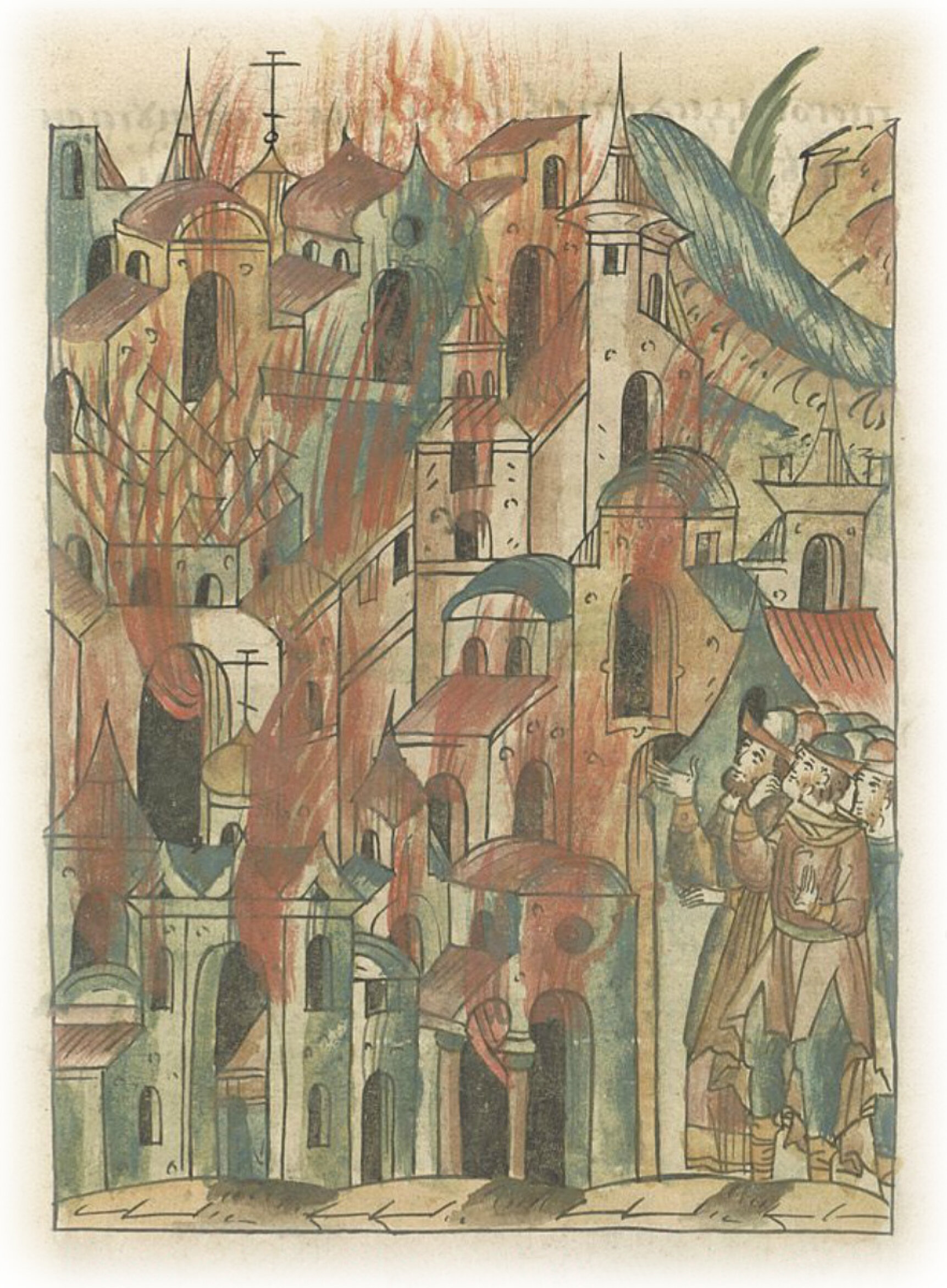 О пожаре в Нижнем Новгороде. В том же году в июле, в 3 час ночи, с четверга на десятую пятницу после Пасхи, загорелось в Нижнем Новгороде на посаде повыше церкви Козьмы и Дамиана. И огонь перекинулся на город, и загорелась кровля на городской стене, и от той кровли загорелось зелье пушечное в Ивановской стрельнице, и от того упала стрельница та, и внутри сгорел двор великого князя, и иных дворов сгорело немало.