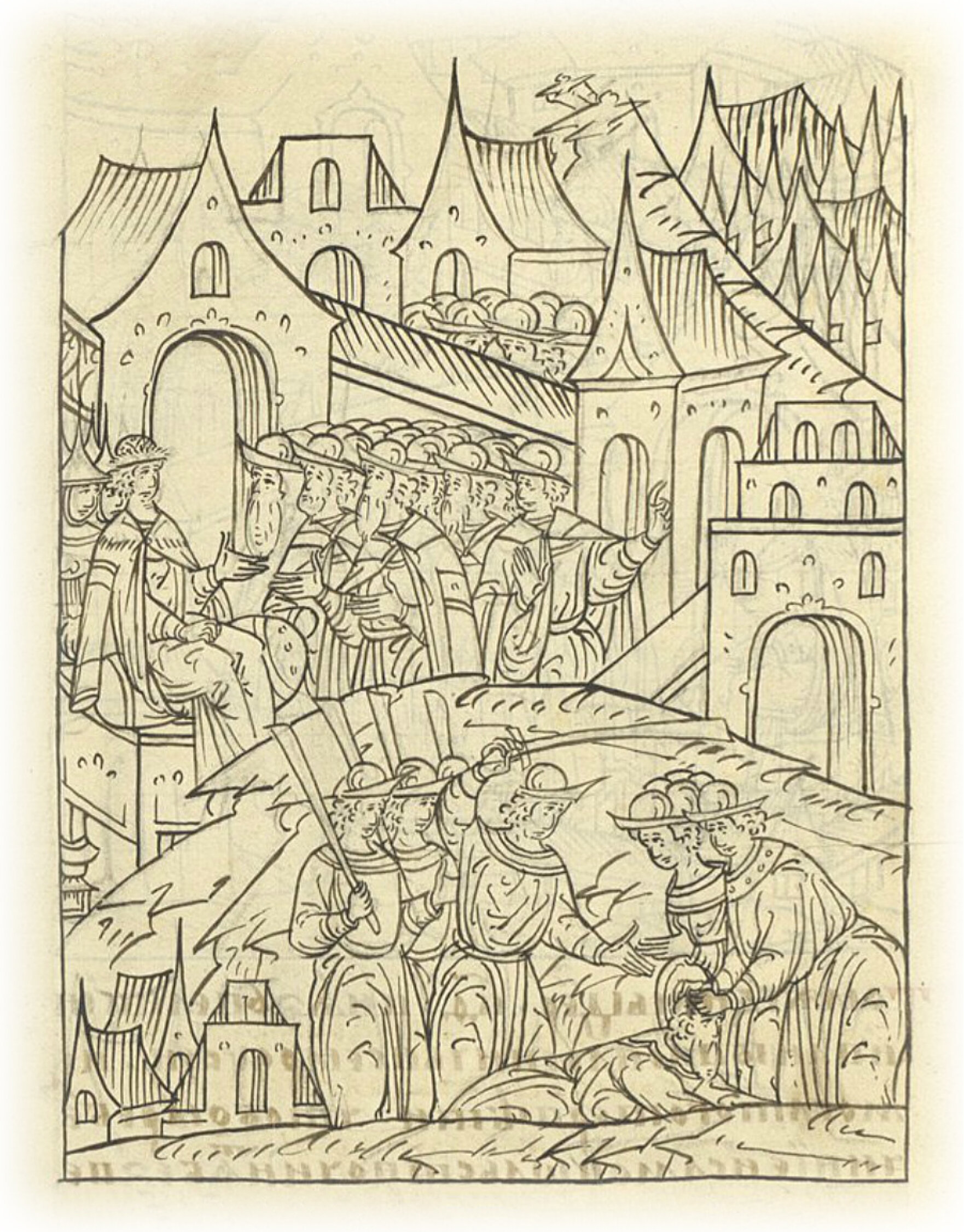 Языки говорят воеводам царя Ивана Васильевича, что магистр окопался большим рвом вокруг города Рындола, бьет из пушек и пищалей и приступает к Рындолу.