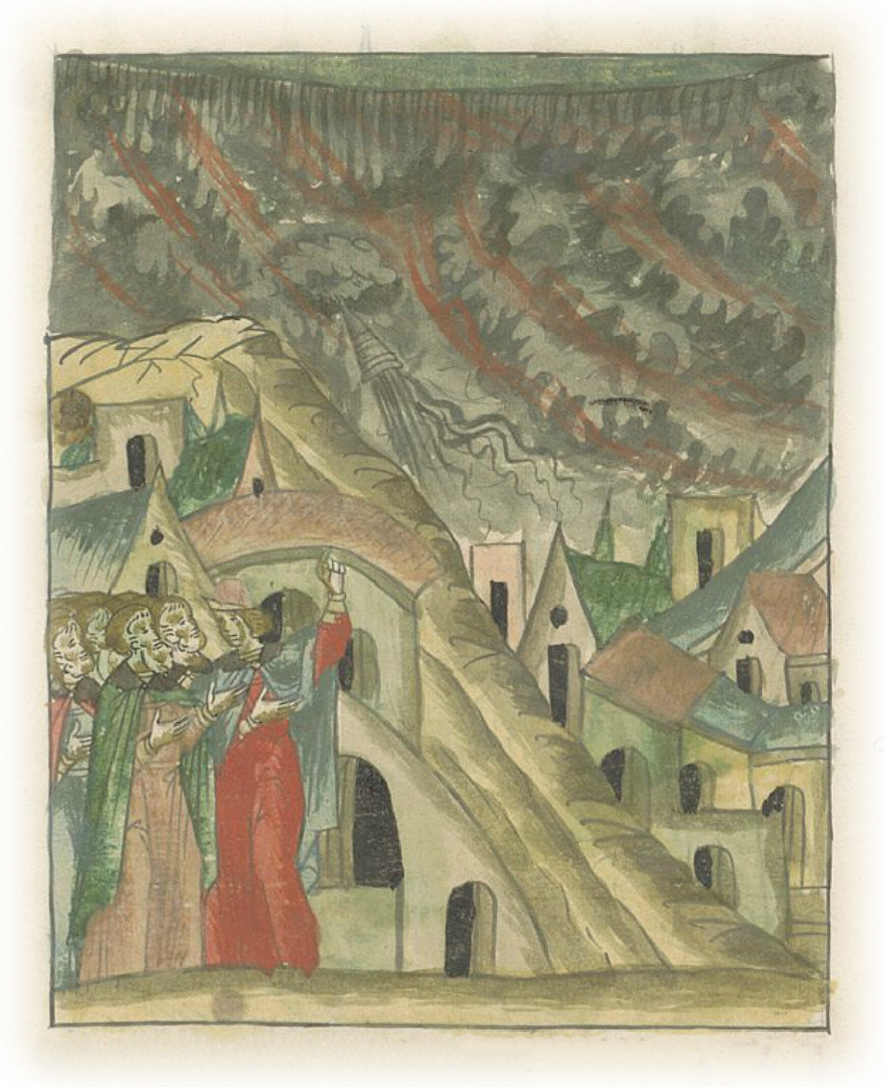 В том же месяце в 23 день после вечерни взошла туча, да гром сначала малый, а потом и великий, с полудня, с молнией, да и дождь великий; а морозы и холод до второго мая, а с того дня пошли дожди каждый день.